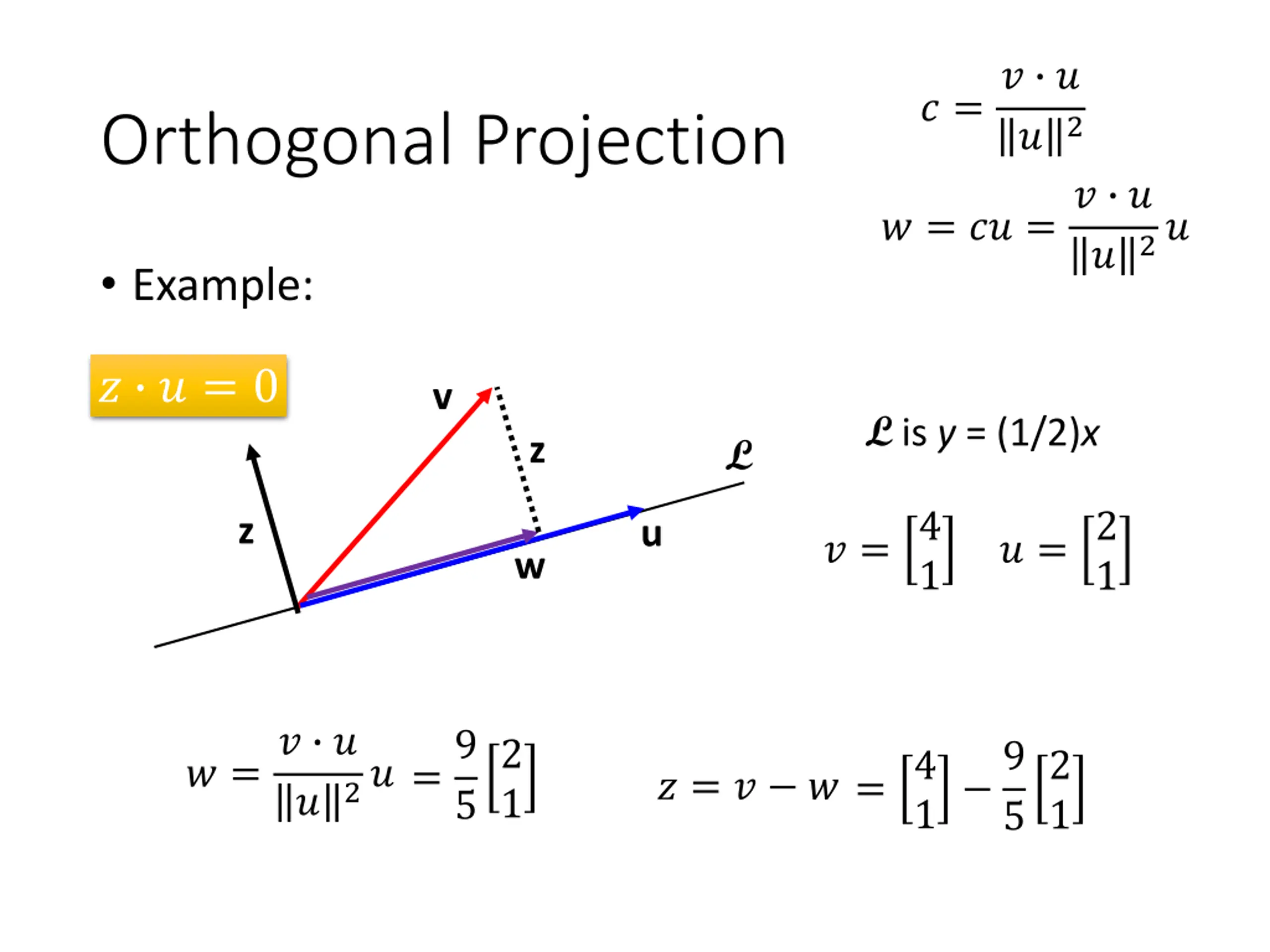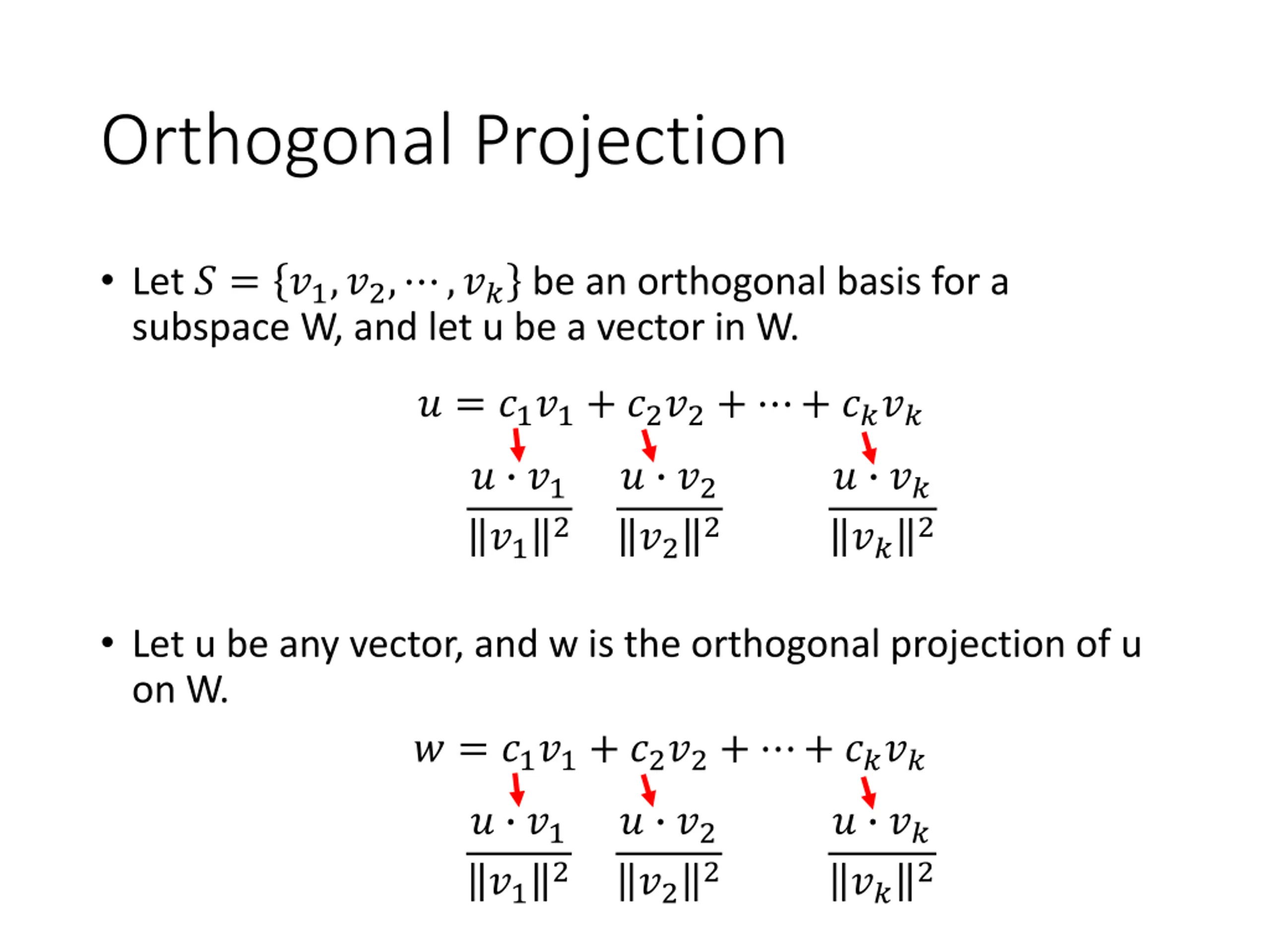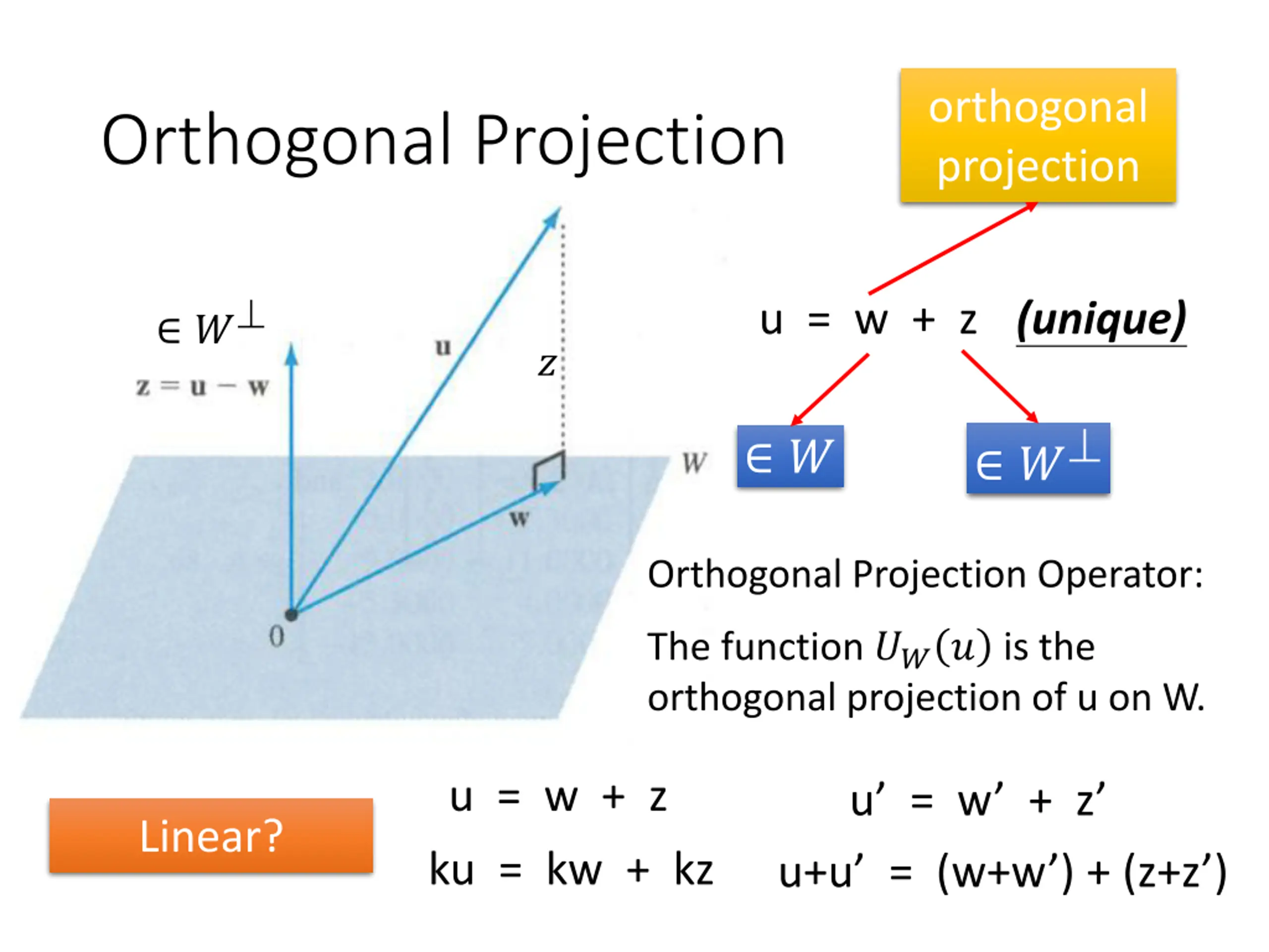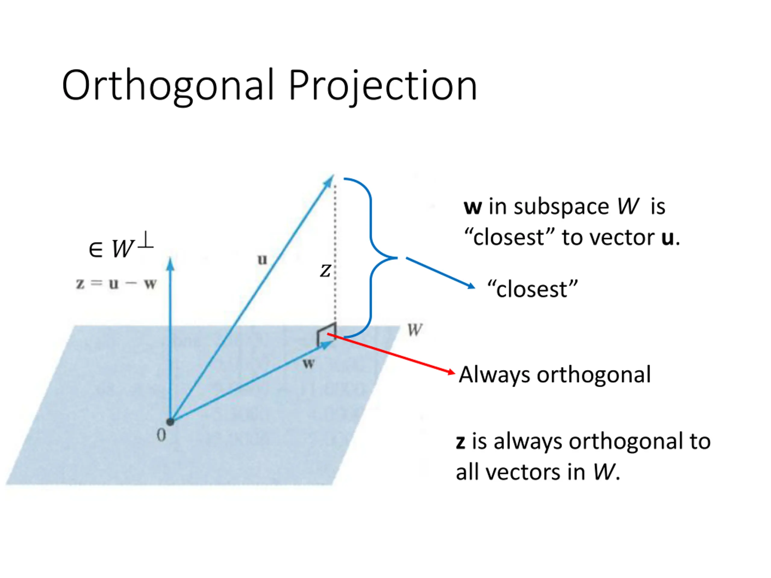 Orthogonal Projection w in subspace W is closest to vector u. ? ? closest Always orthogonal z is always orthogonal to all vectors in W.