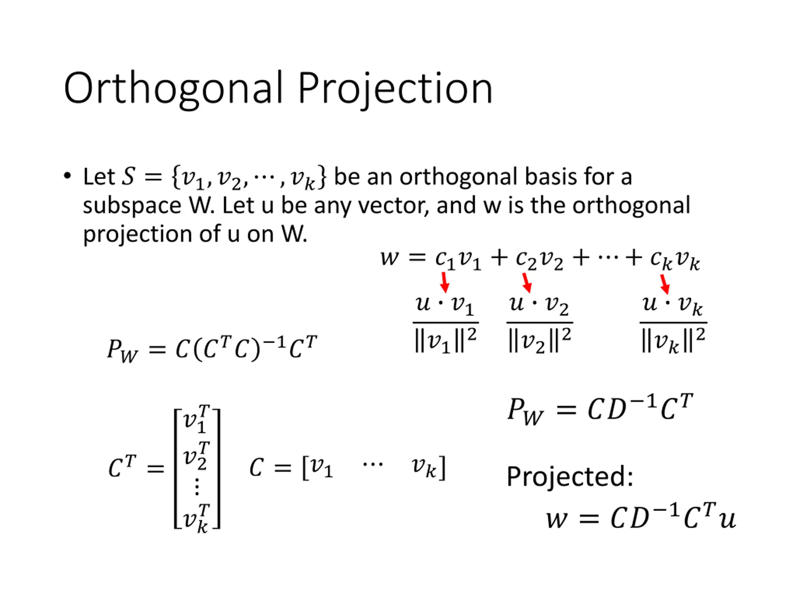 Orthogonal Projection Matrix Let C be an n x k matrix whose columns form a basis for a subspace W ??= ? ??? 1?? kxn nxk n x n kxn nxk Proof: Let u Rnand w = UW(u). Since W = Col C, w = Cb for some b Rk and u w W 0 = CT(u w) = CTu CTw = CTu CTCb. CTu = CTCb. b = (CTC) 1CTu and w = C(CTC) 1CTu as CTC is invertible.