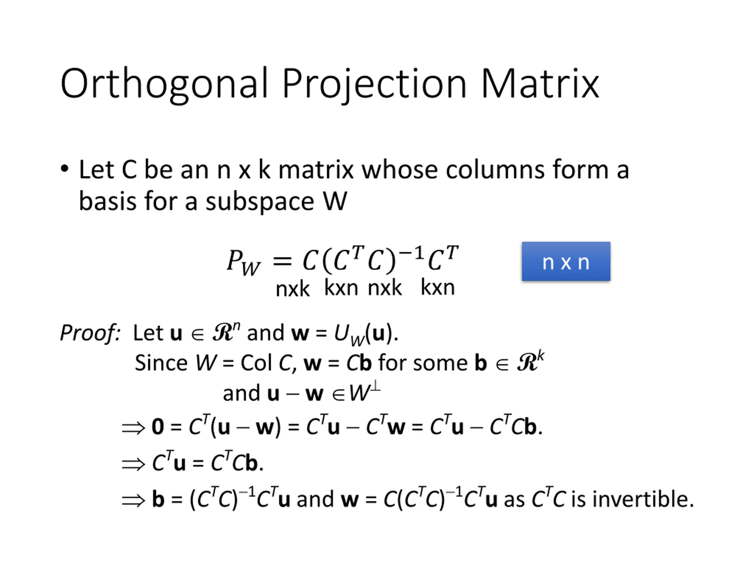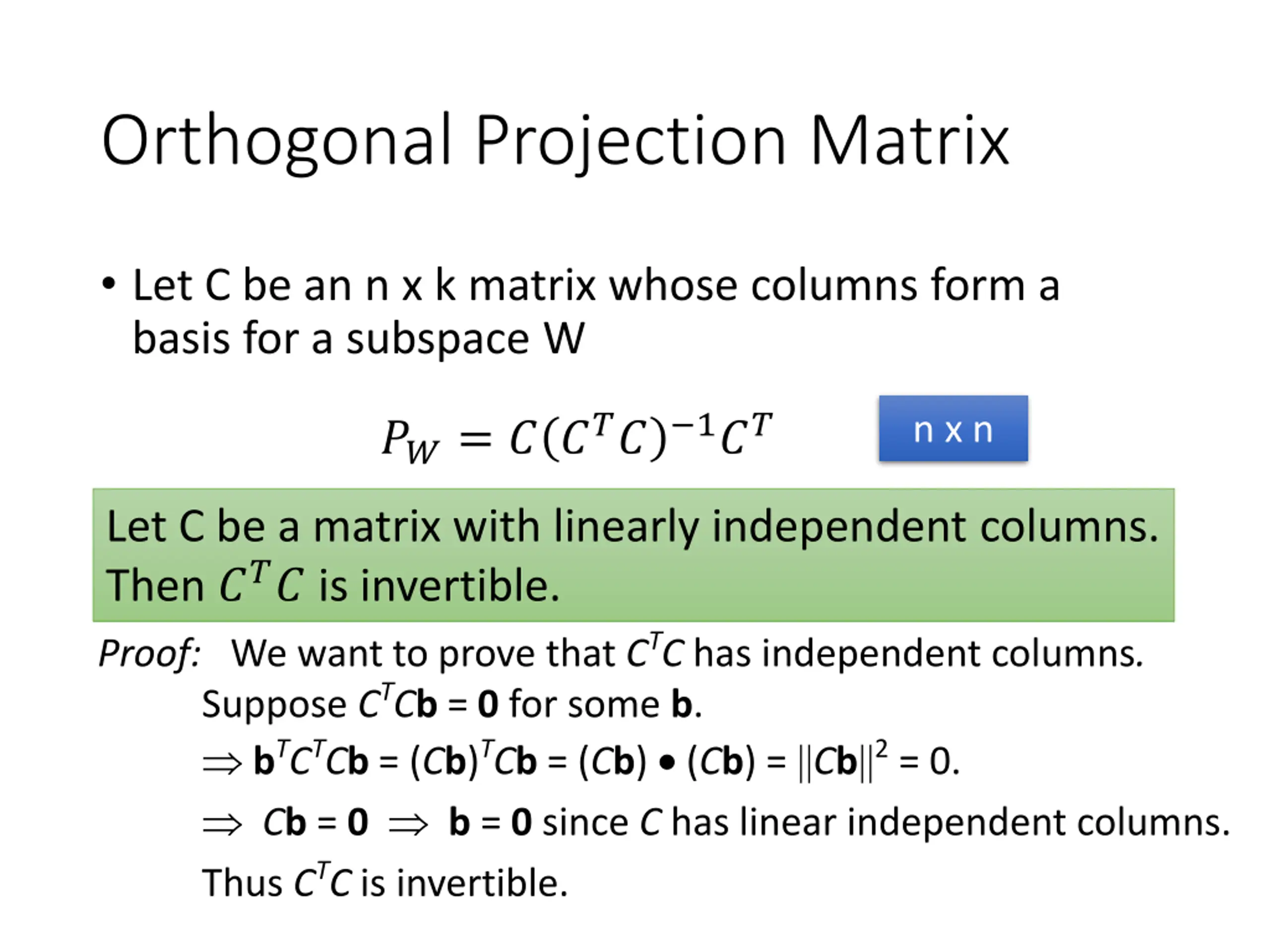 Orthogonal Projection Matrix Let C be an n x k matrix whose columns form a basis for a subspace W ??= ? ??? 1?? n x n Let C be a matrix with linearly independent columns. Then ??? is invertible. Proof: We want to prove that CTC has independent columns. Suppose CTCb = 0 for some b. bTCTCb = (Cb)TCb = (Cb) (Cb) = Cb 2= 0. Cb = 0 b = 0 since C has linear independent columns. Thus CTC is invertible.
