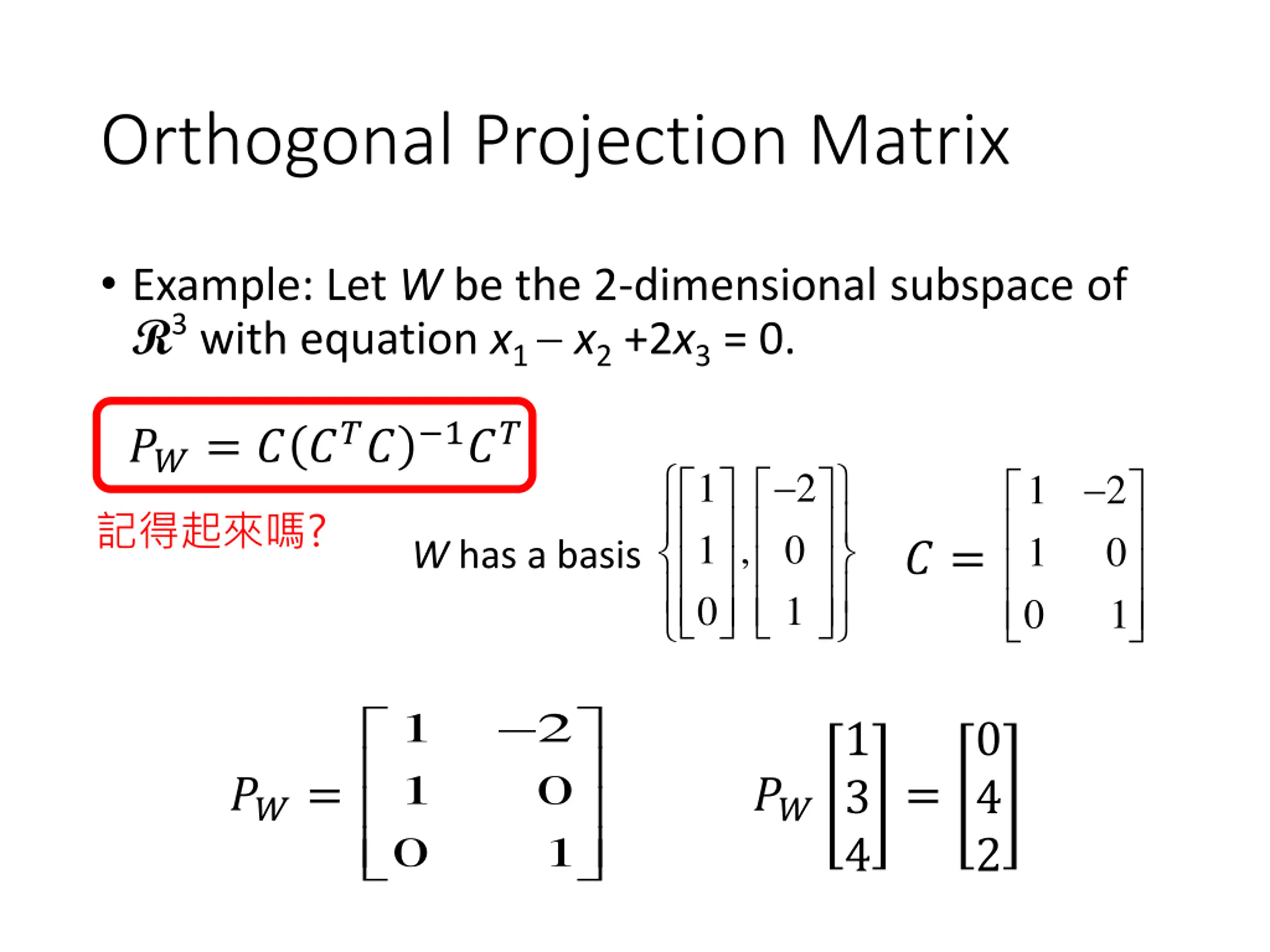 Orthogonal Projection Matrix Example: Let W be the 2-dimensional subspace of R3with equation x1 x2+2x3= 0. ??= ? ??? 1?? ? 1 1 , 0 0 2 1 1 0 2 0 1 ? = W has a basis 1 1 1 0 2 0 1 1 3 4 0 4 2 ??= ?? =