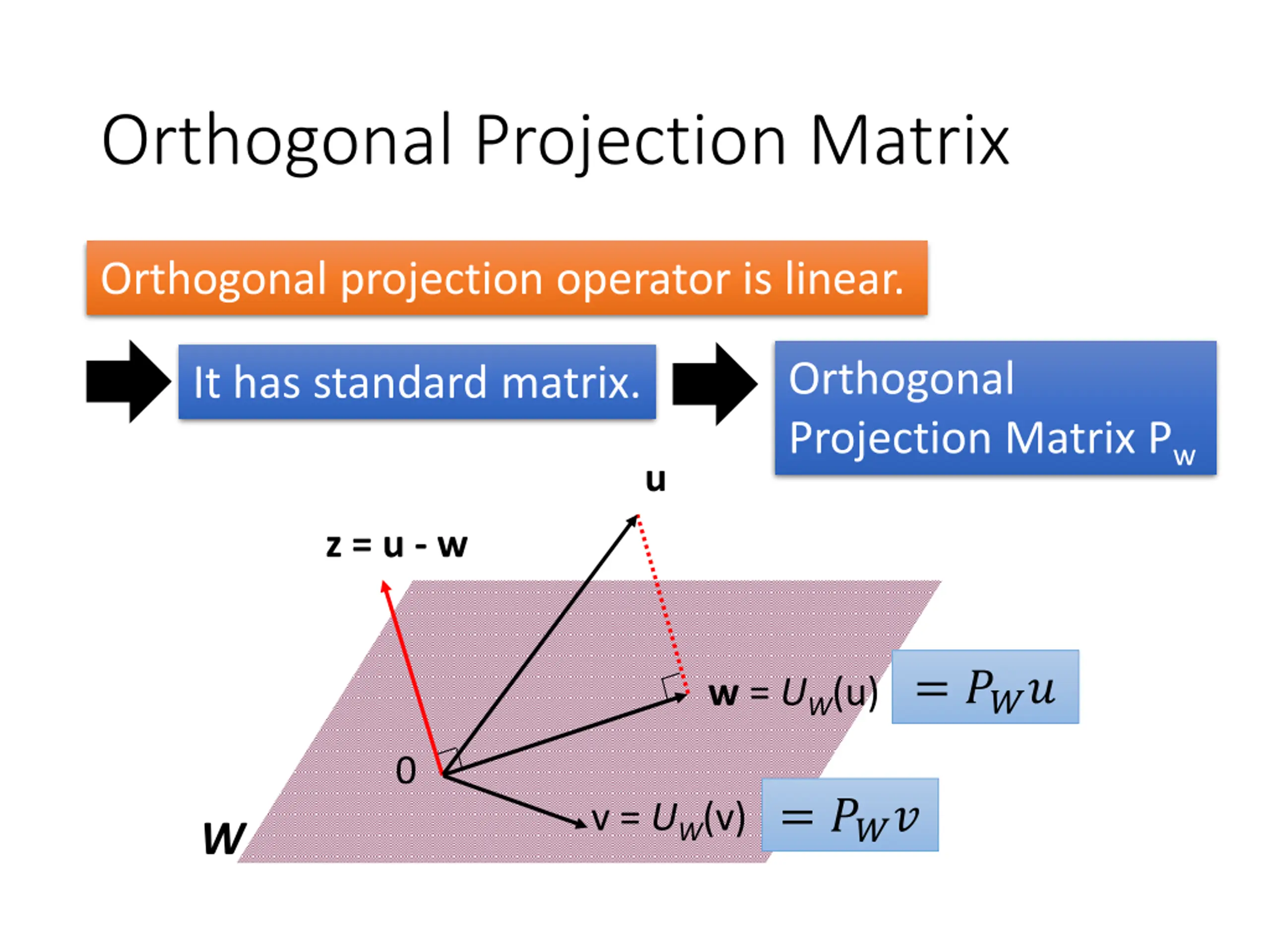Orthogonal Projection Matrix Orthogonal projection operator is linear. Orthogonal Projection Matrix Pw It has standard matrix. u z = u - w = ??? w = UW(u) 0 = ??? v = UW(v) W