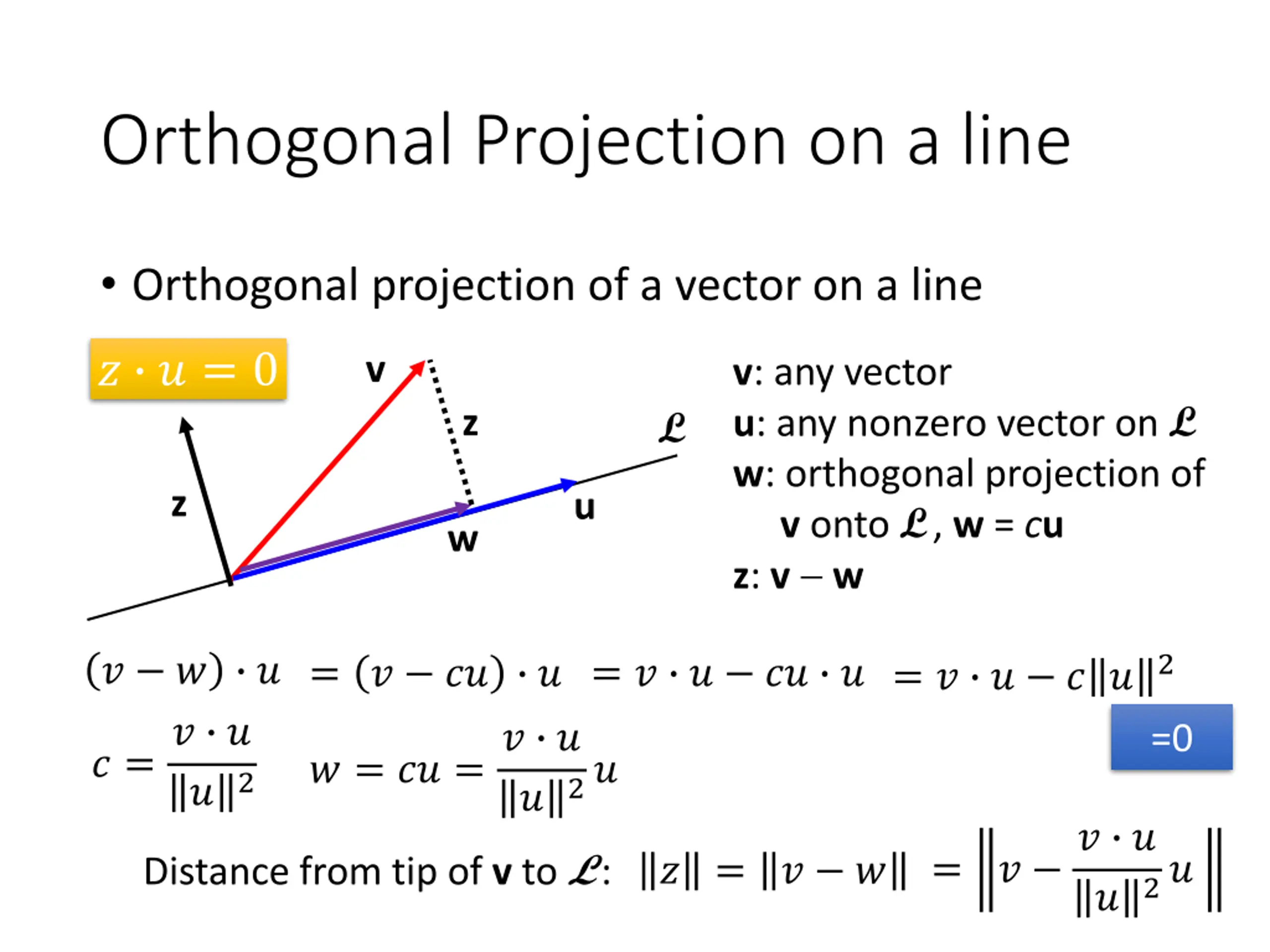 Orthogonal Projection on a line Orthogonal projection of a vector on a line ? ? = 0 v v: any vector u: any nonzero vector on L w: orthogonal projection of v onto L, w = cu z: v w L z z u w 2 ? ? ? = ? ?? ? = ? ? ?? ? = ? ? ? ? ? =? ? ?2 ? = ?? =? ? =0 ?2? = ? ? ? Distance from tip of v to L: ?2? ? = ? ?