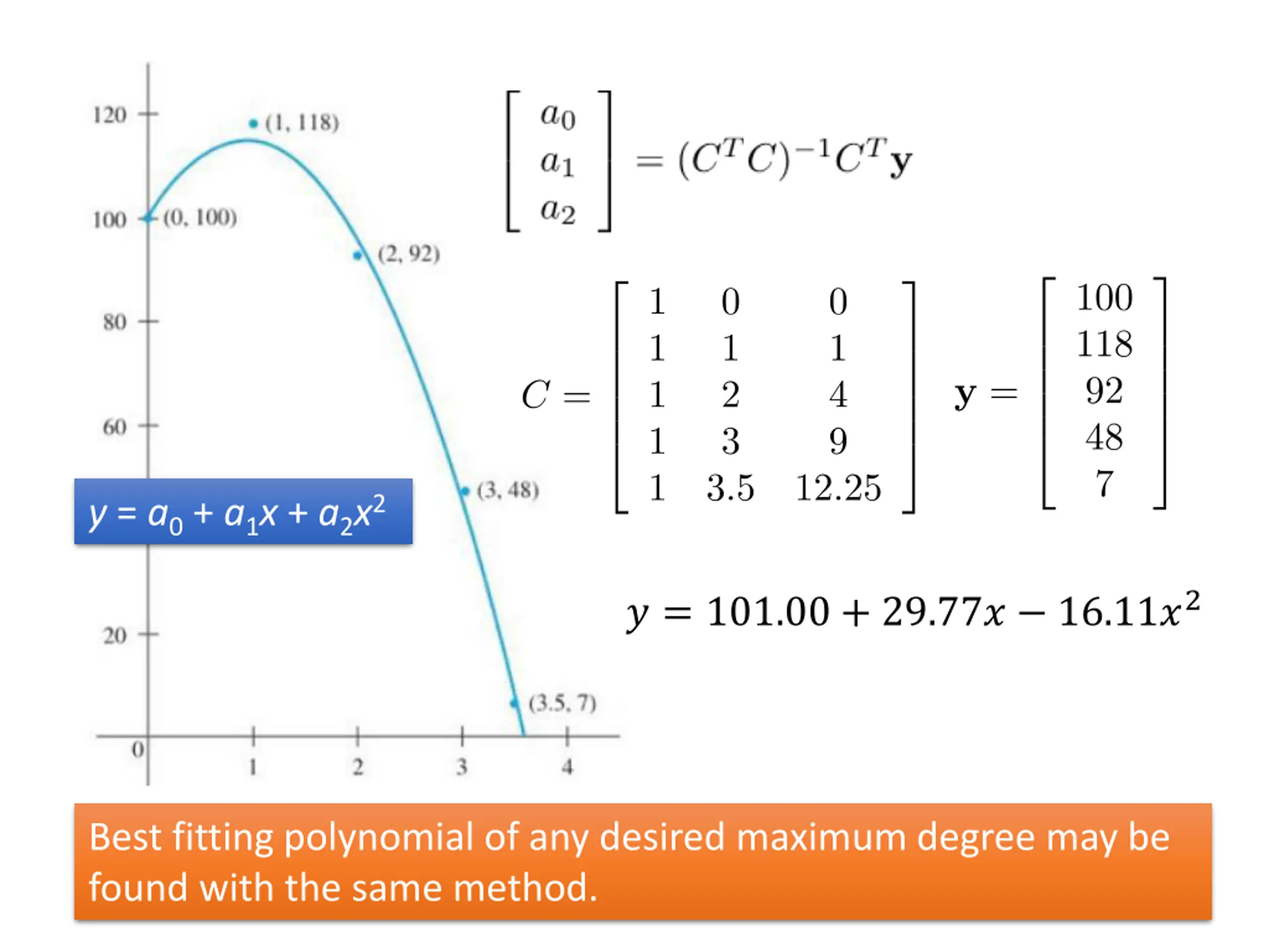 y = a0+ a1x + a2x2 ? = 101.00 + 29.77? 16.11?2 Best fitting polynomial of any desired maximum degree may be found with the same method.