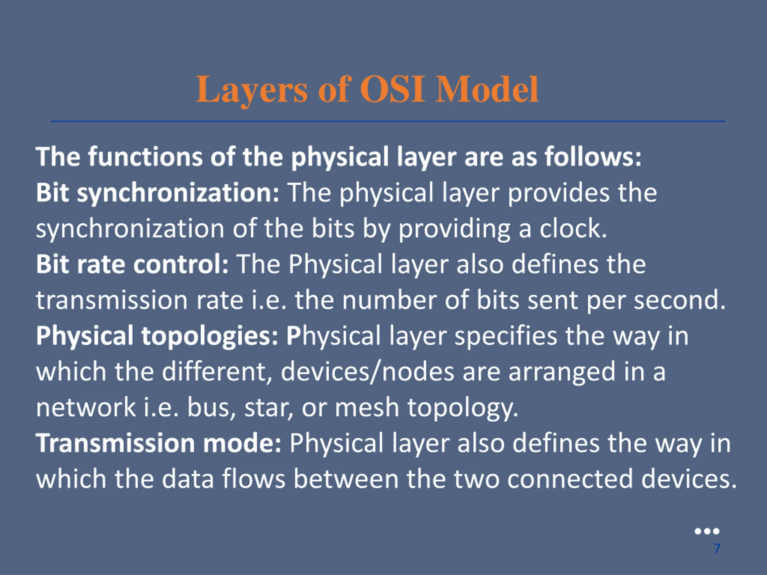 Layers of OSI Model The functions of the physical layer are as follows: Bit synchronization: The physical layer provides the synchronization of the bits by providing a clock. Bit rate control: The Physical layer also defines the transmission rate i.e. the number of bits sent per second. Physical topologies: Physical layer specifies the way in which the different, devices/nodes are arranged in a network i.e. bus, star, or mesh topology. Transmission mode: Physical layer also defines the way in which the data flows between the two connected devices. 7