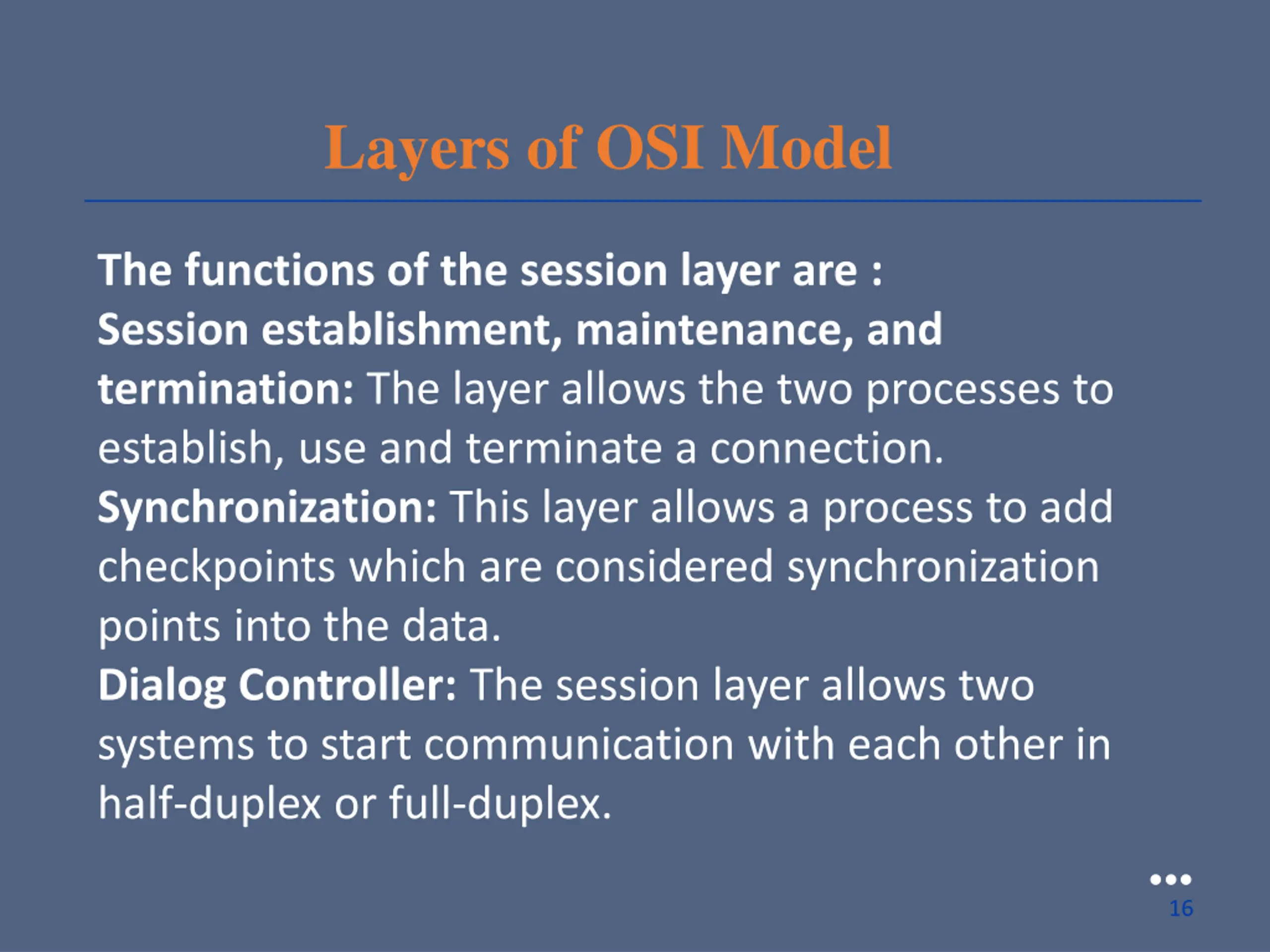 Layers of OSI Model The functions of the session layer are : Session establishment, maintenance, and termination: The layer allows the two processes to establish, use and terminate a connection. Synchronization: This layer allows a process to add checkpoints which are considered synchronization points into the data. Dialog Controller: The session layer allows two systems to start communication with each other in half-duplex or full-duplex. 16