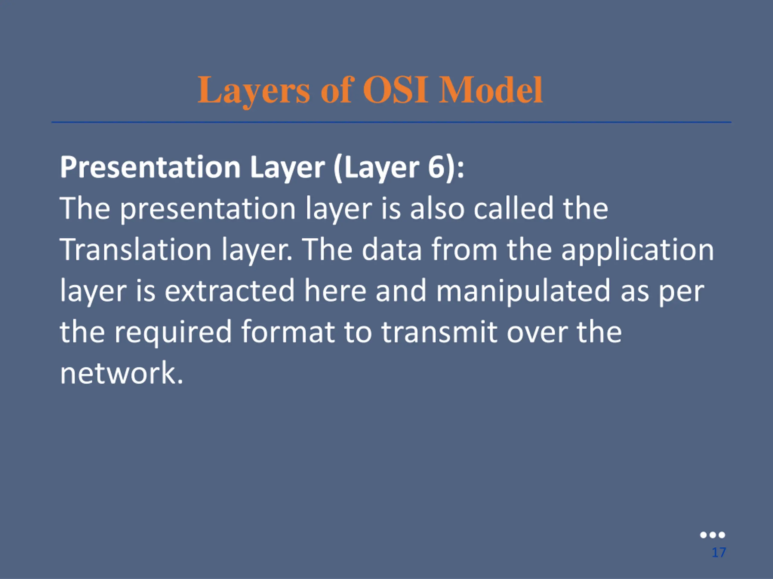 Layers of OSI Model Presentation Layer (Layer 6): The presentation layer is also called the Translation layer. The data from the application layer is extracted here and manipulated as per the required format to transmit over the network. 17