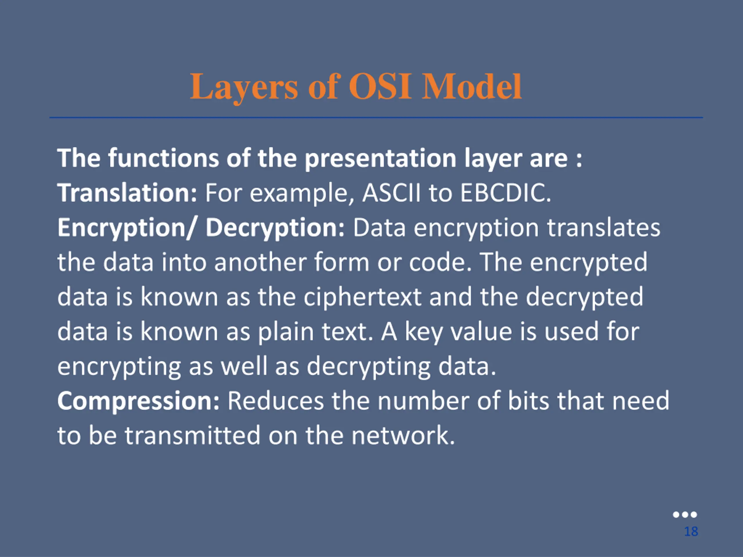 Layers of OSI Model The functions of the presentation layer are : Translation: For example, ASCII to EBCDIC. Encryption/ Decryption: Data encryption translates the data into another form or code. The encrypted data is known as the ciphertext and the decrypted data is known as plain text. A key value is used for encrypting as well as decrypting data. Compression: Reduces the number of bits that need to be transmitted on the network. 18