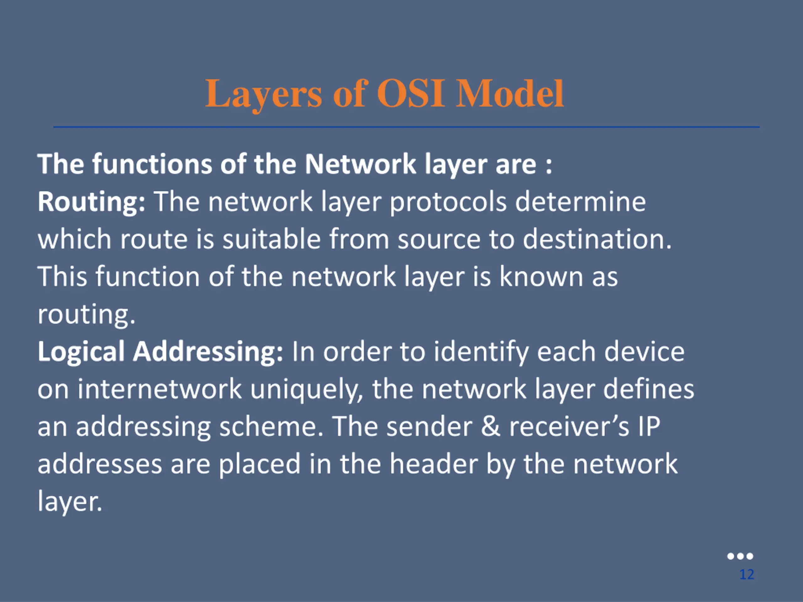 Layers of OSI Model The functions of the Network layer are : Routing: The network layer protocols determine which route is suitable from source to destination. This function of the network layer is known as routing. Logical Addressing: In order to identify each device on internetwork uniquely, the network layer defines an addressing scheme. The sender & receiver s IP addresses are placed in the header by the network layer. 12