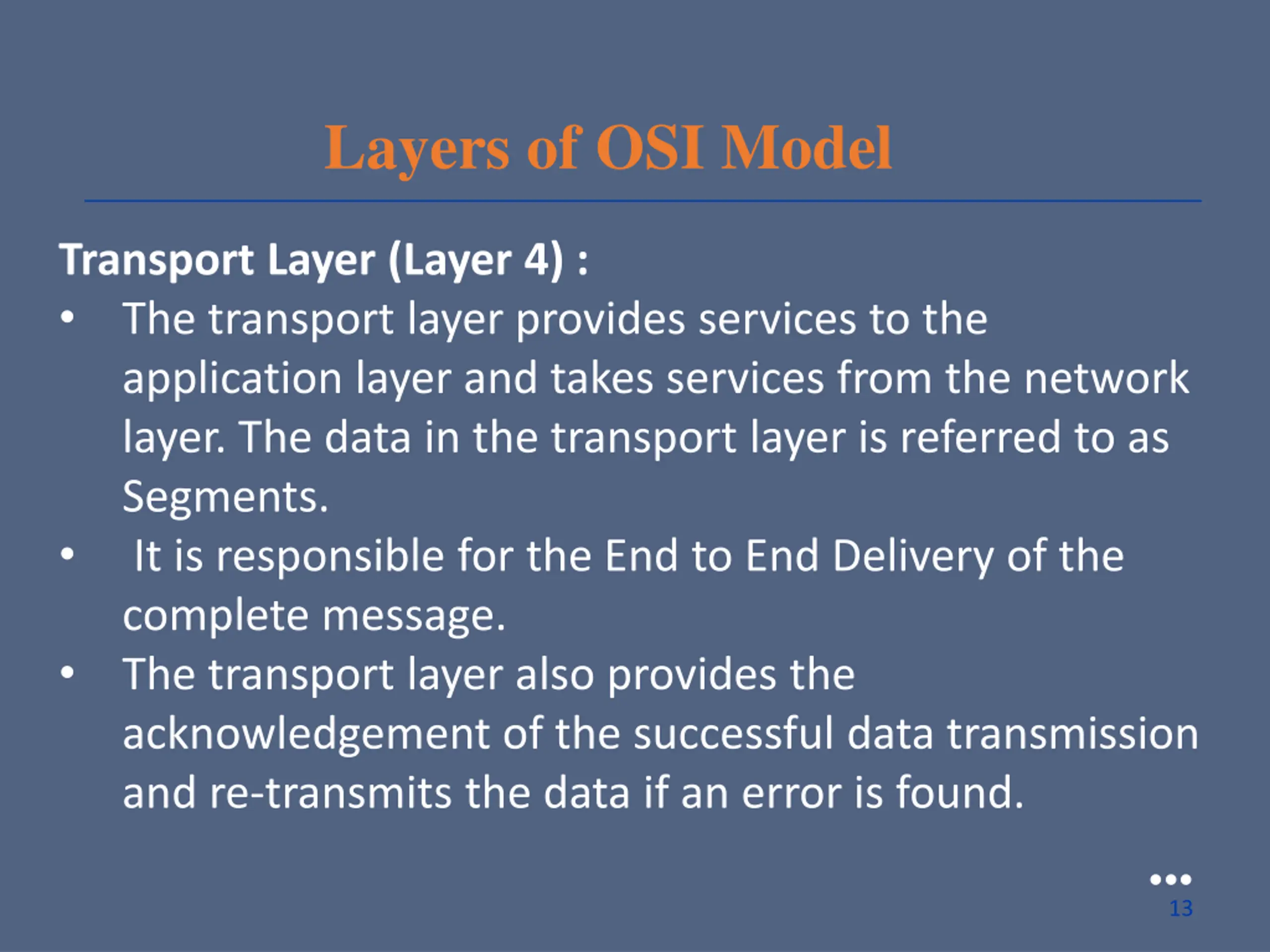 Layers of OSI Model Transport Layer (Layer 4) : The transport layer provides services to the application layer and takes services from the network layer. The data in the transport layer is referred to as Segments. It is responsible for the End to End Delivery of the complete message. The transport layer also provides the acknowledgement of the successful data transmission and re-transmits the data if an error is found. 13