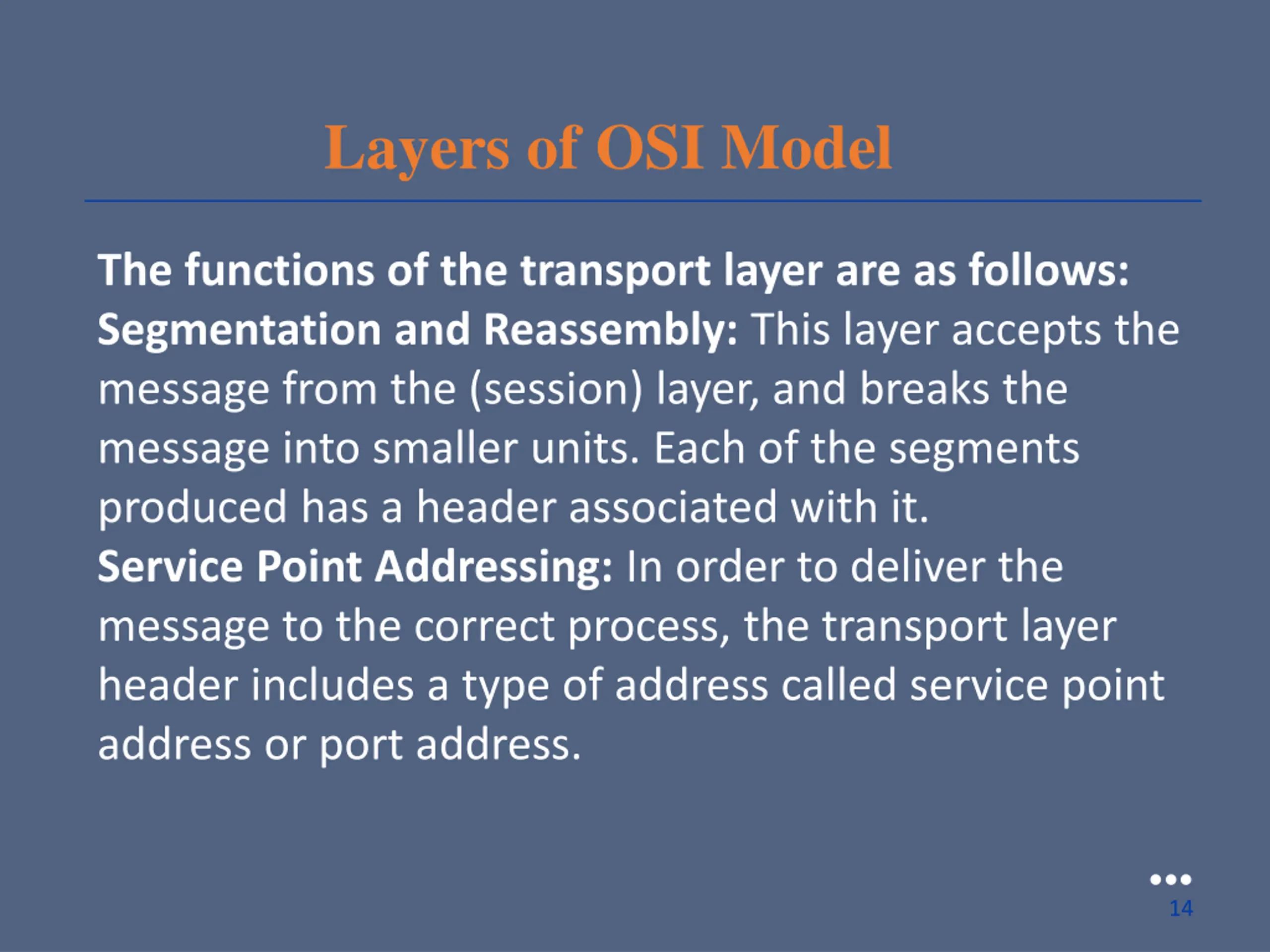 Layers of OSI Model The functions of the transport layer are as follows: Segmentation and Reassembly: This layer accepts the message from the (session) layer, and breaks the message into smaller units. Each of the segments produced has a header associated with it. Service Point Addressing: In order to deliver the message to the correct process, the transport layer header includes a type of address called service point address or port address. 14