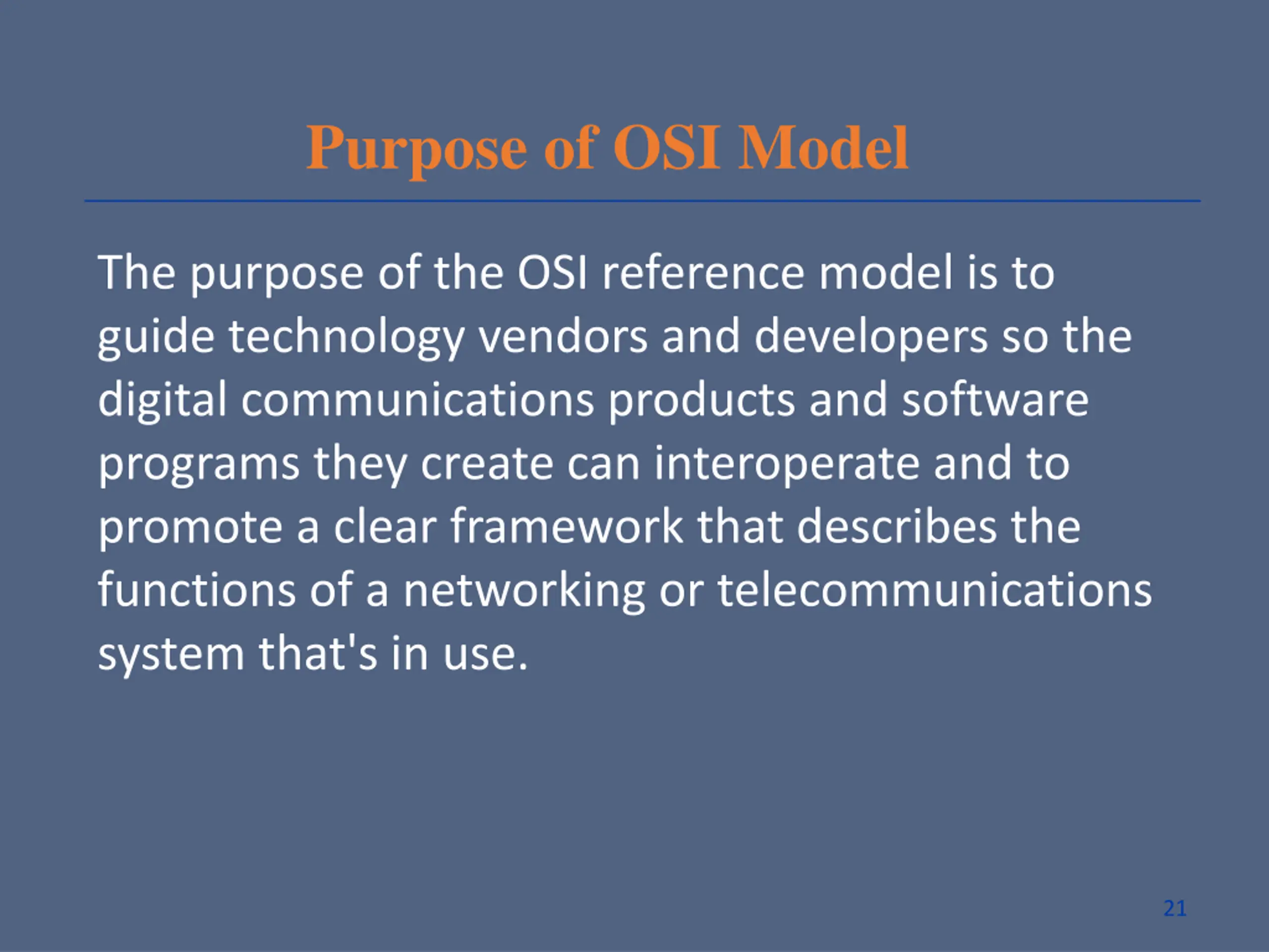 Purpose of OSI Model The purpose of the OSI reference model is to guide technology vendors and developers so the digital communications products and software programs they create can interoperate and to promote a clear framework that describes the functions of a networking or telecommunications system that's in use. 21