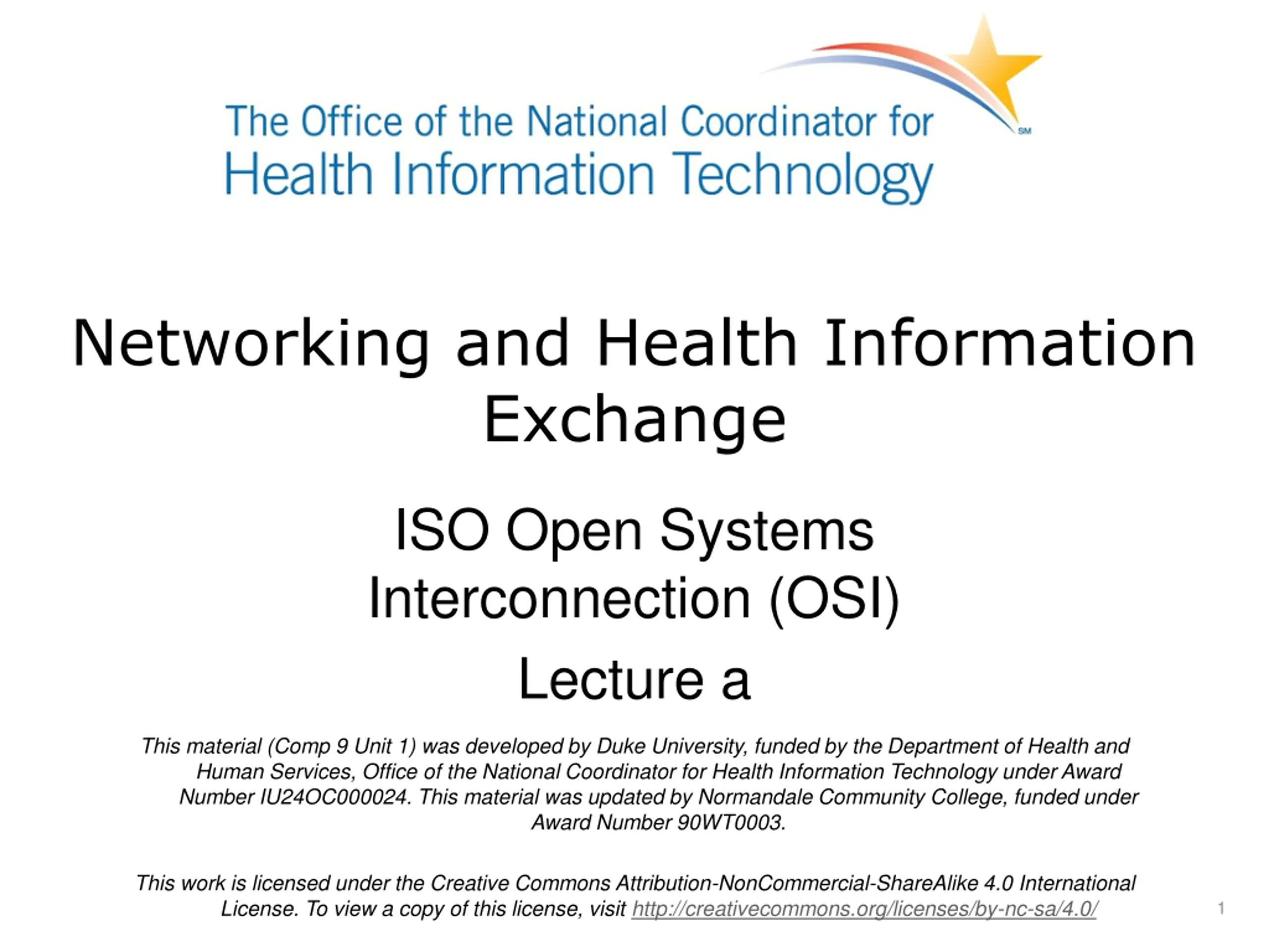 Networking and Health Information Exchange ISO Open Systems Interconnection (OSI) Lecture a This material (Comp 9 Unit 1) was developed by Duke University, funded by the Department of Health and Human Services, Office of the National Coordinator for Health Information Technology under Award Number IU24OC000024. This material was updated by Normandale Community College, funded under Award Number 90WT0003. This work is licensed under the Creative Commons Attribution-NonCommercial-ShareAlike 4.0 International License. To view a copy of this license, visit http://creativecommons.org/licenses/by-nc-sa/4.0/ 1
