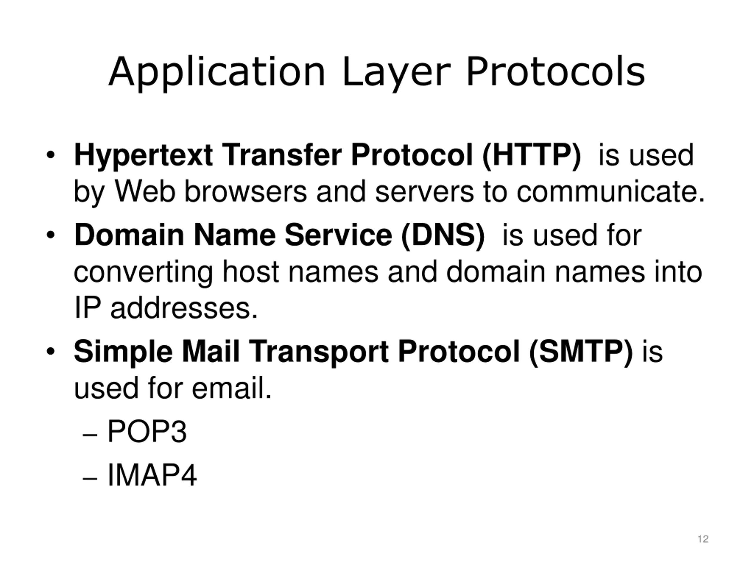 Application Layer Protocols Hypertext Transfer Protocol (HTTP) is used by Web browsers and servers to communicate. Domain Name Service (DNS) is used for converting host names and domain names into IP addresses. Simple Mail Transport Protocol (SMTP) is used for email. POP3 IMAP4 12