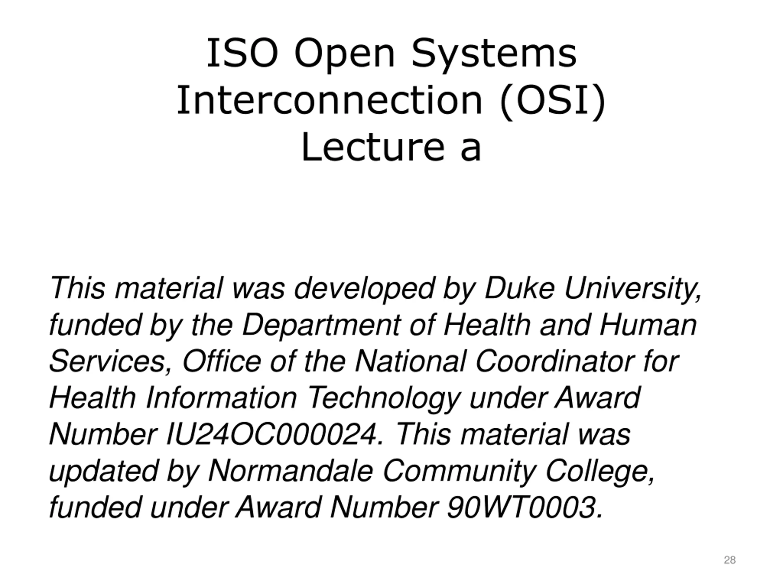ISO Open Systems Interconnection (OSI) Lecture a This material was developed by Duke University, funded by the Department of Health and Human Services, Office of the National Coordinator for Health Information Technology under Award Number IU24OC000024. This material was updated by Normandale Community College, funded under Award Number 90WT0003. 28