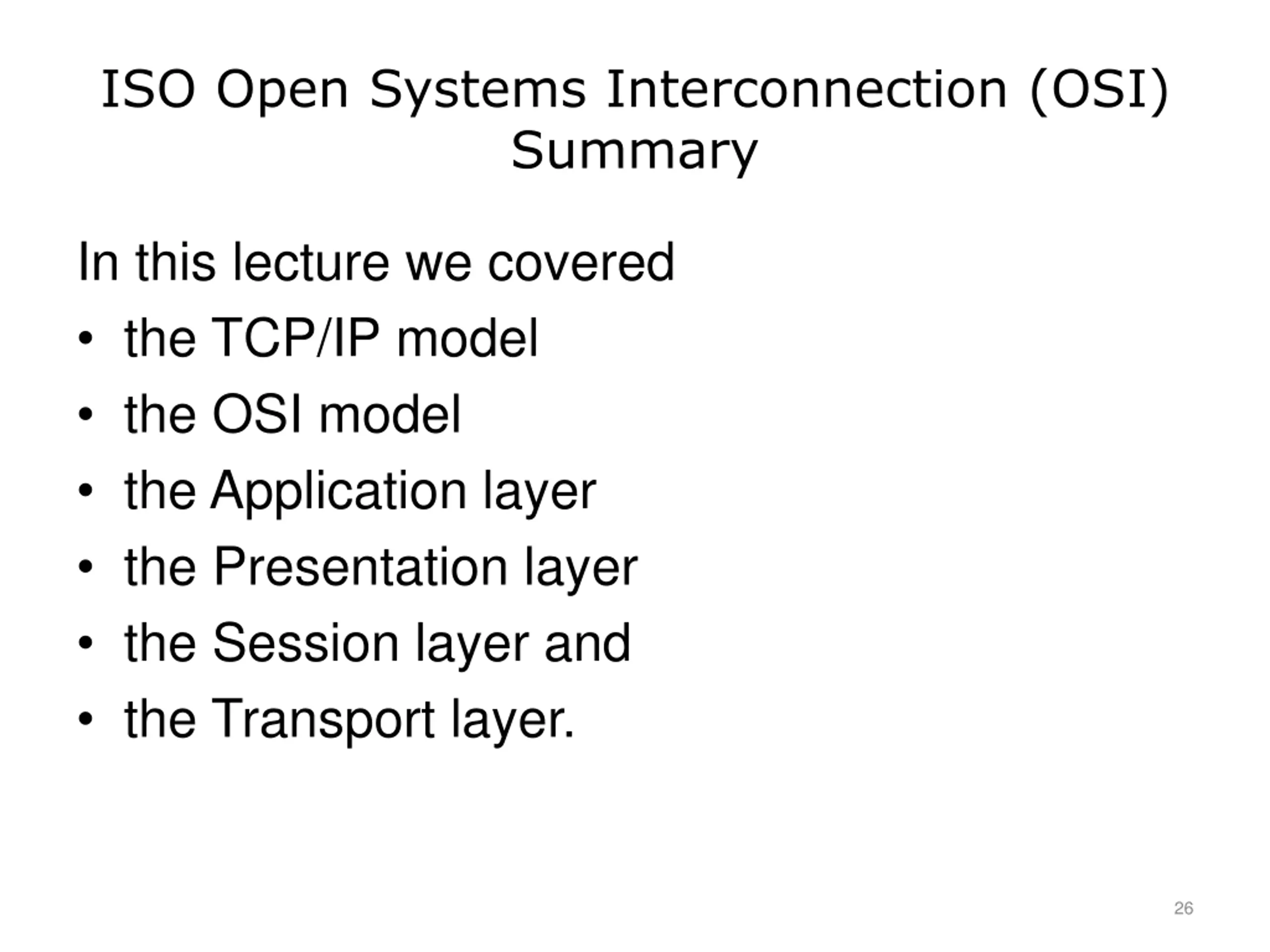 ISO Open Systems Interconnection (OSI) Summary In this lecture we covered the TCP/IP model the OSI model the Application layer the Presentation layer the Session layer and the Transport layer. 26