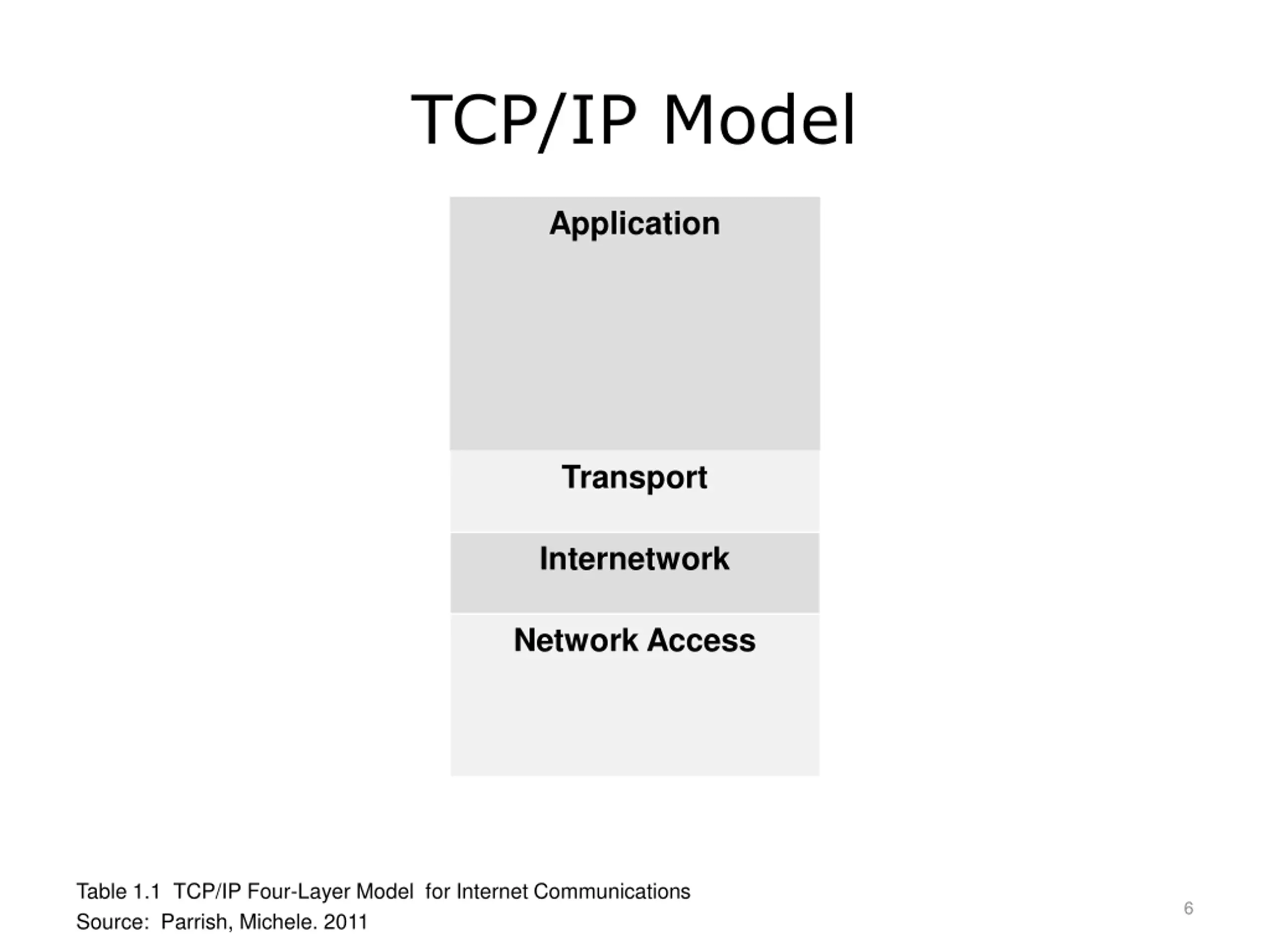 TCP/IP Model Application Transport Internetwork Network Access Table 1.1 TCP/IP Four-Layer Model for Internet Communications Source: Parrish, Michele. 2011 6