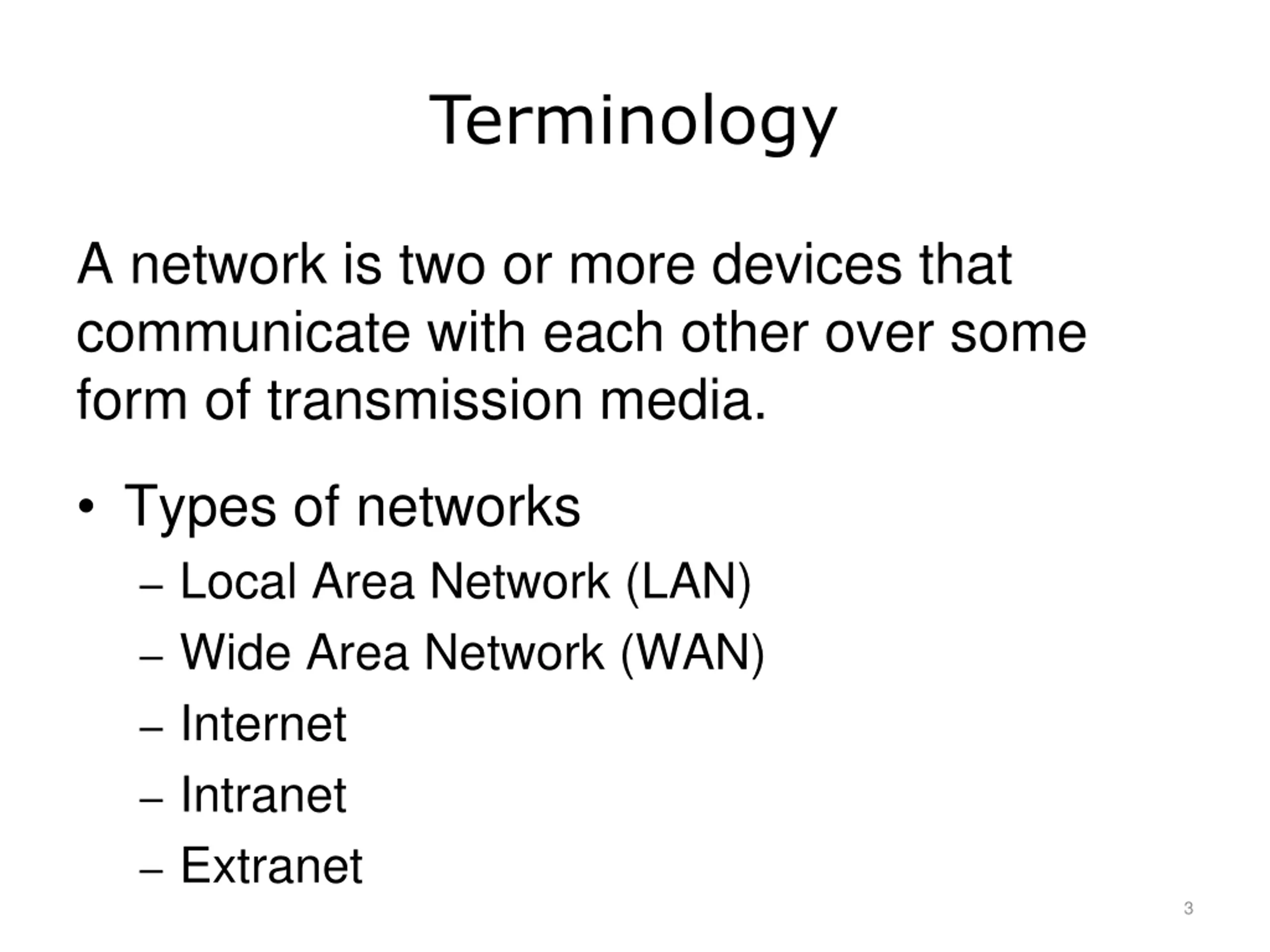 Terminology A network is two or more devices that communicate with each other over some form of transmission media. Types of networks Local Area Network (LAN) Wide Area Network (WAN) Internet Intranet Extranet 3