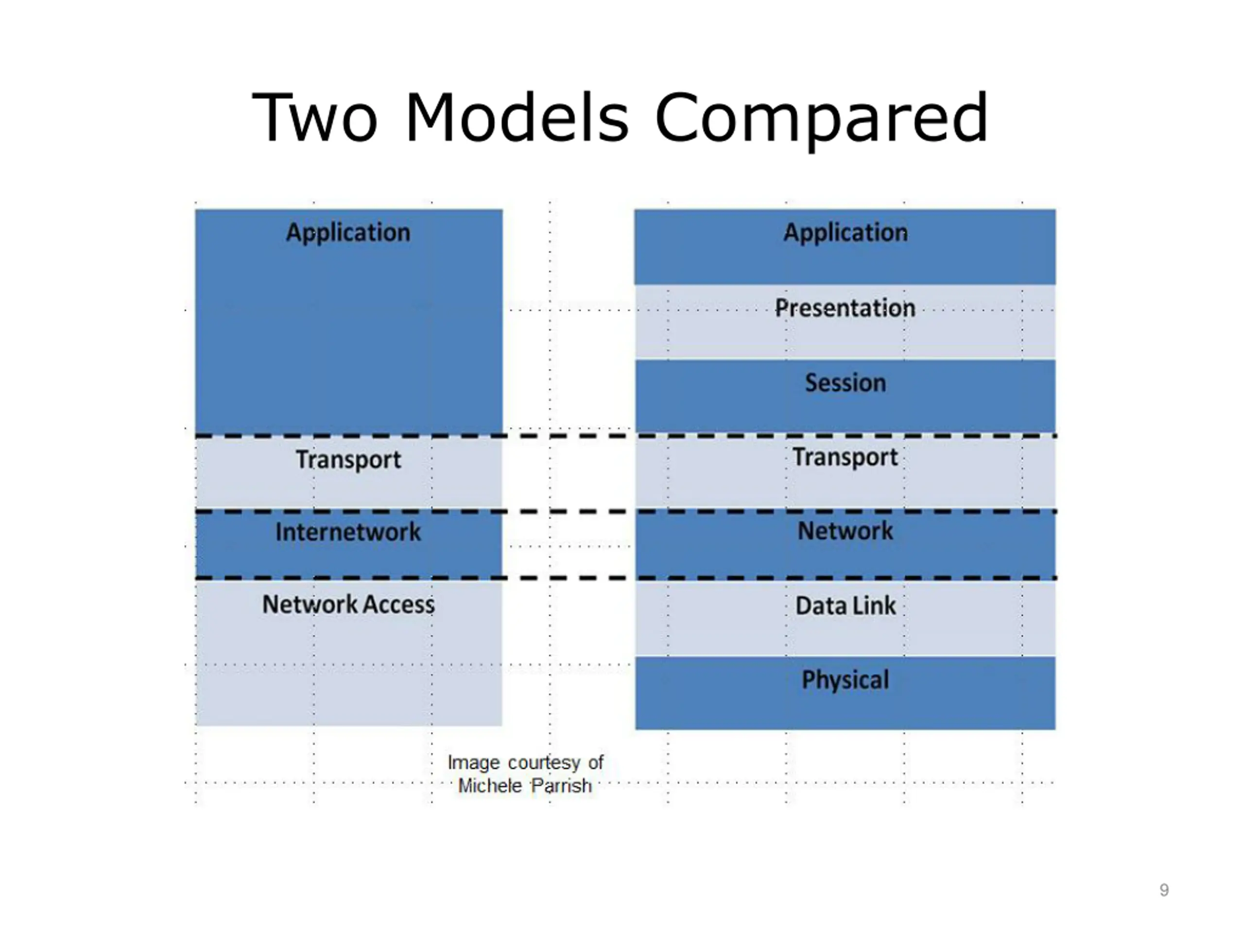 OSI Model Application Presentation Session Transport Network Data Link Physical Table 1.2 OSI Seven-Layer Model for Internet Communications Source: Parrish, Michele. 2011 7