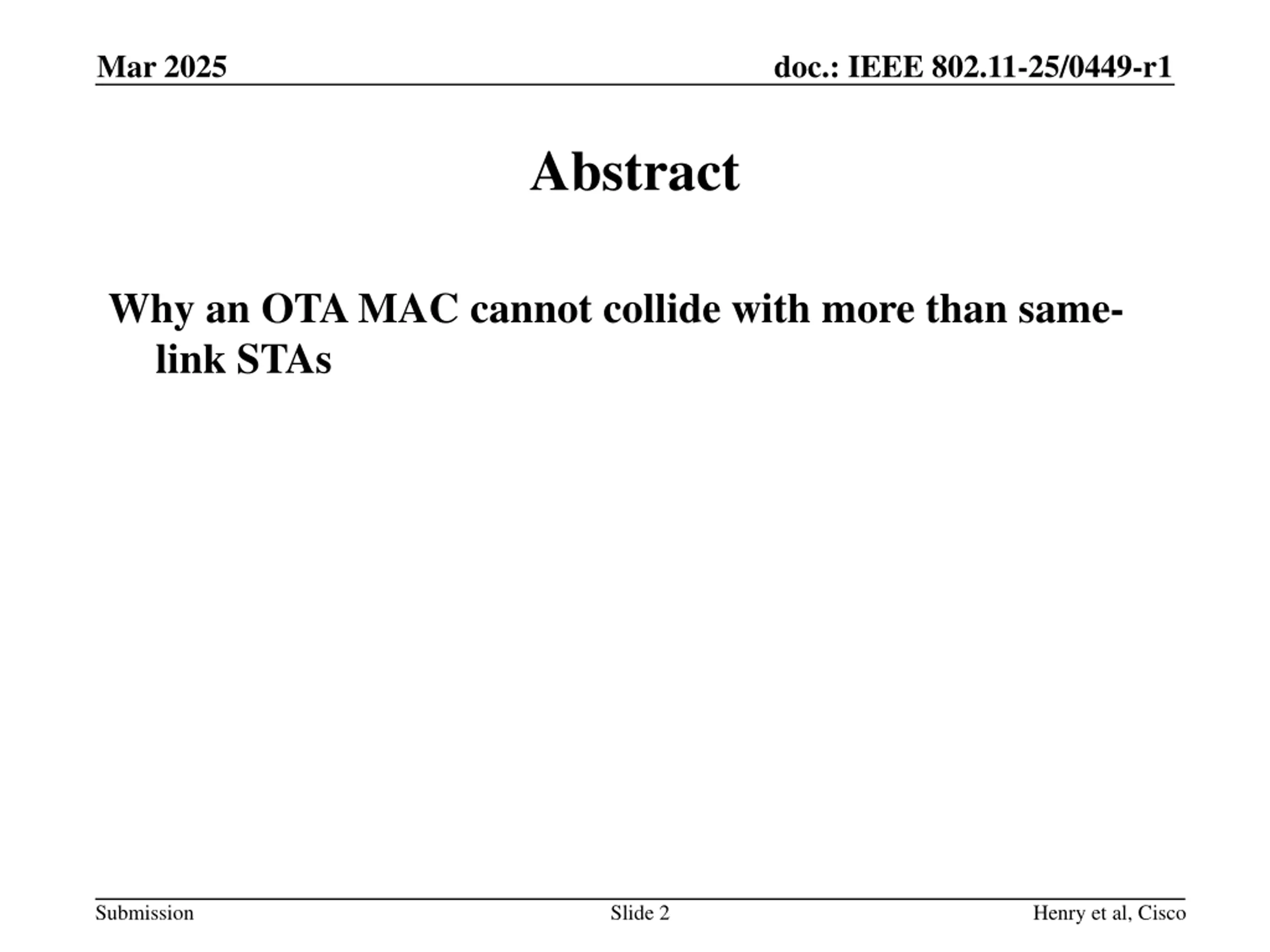 Mar 2025 doc.: IEEE 802.11-25/0449-r1 Abstract Why an OTA MAC cannot collide with more than same- link STAs Submission Slide 2 Henry et al, Cisco -