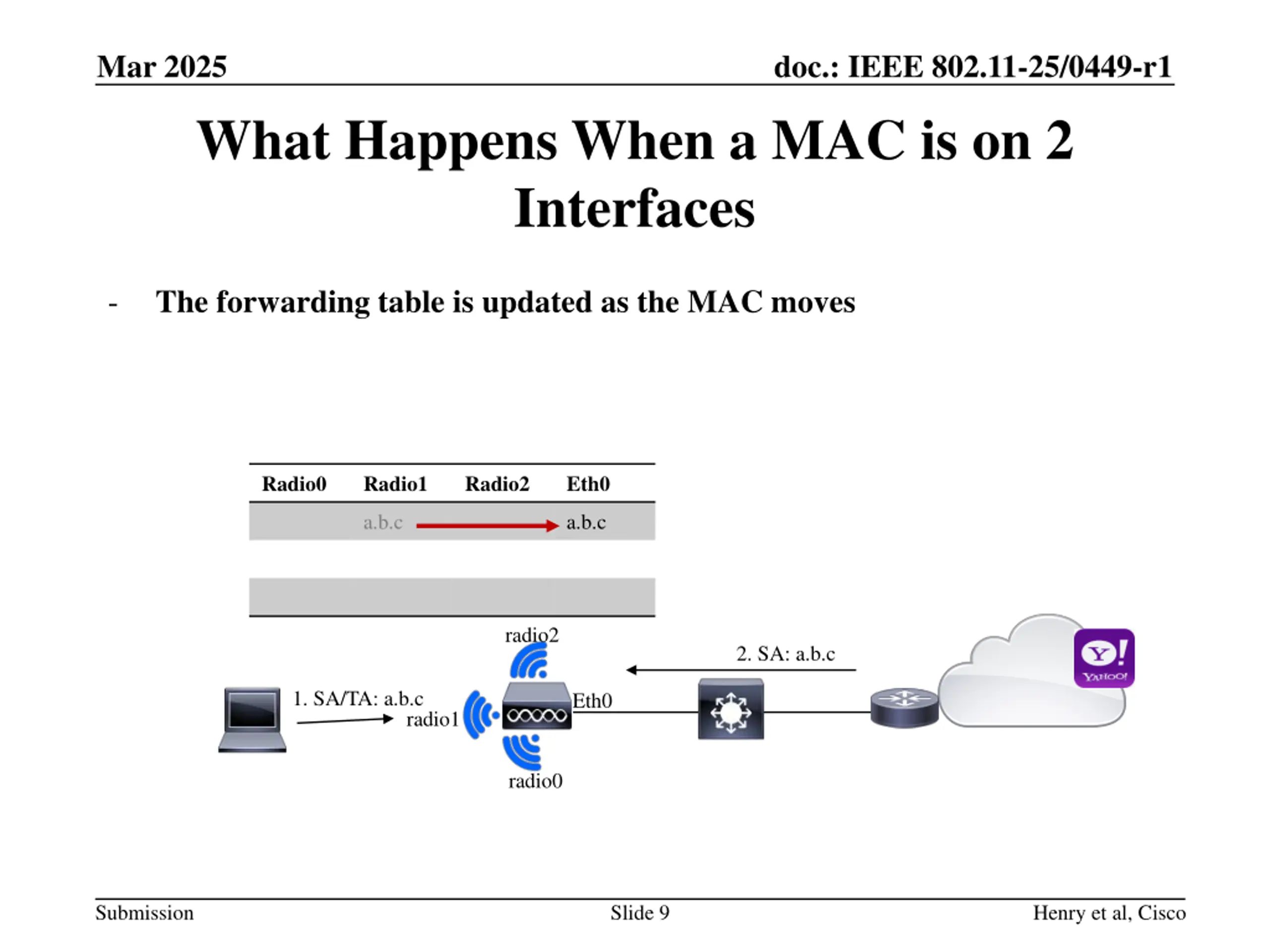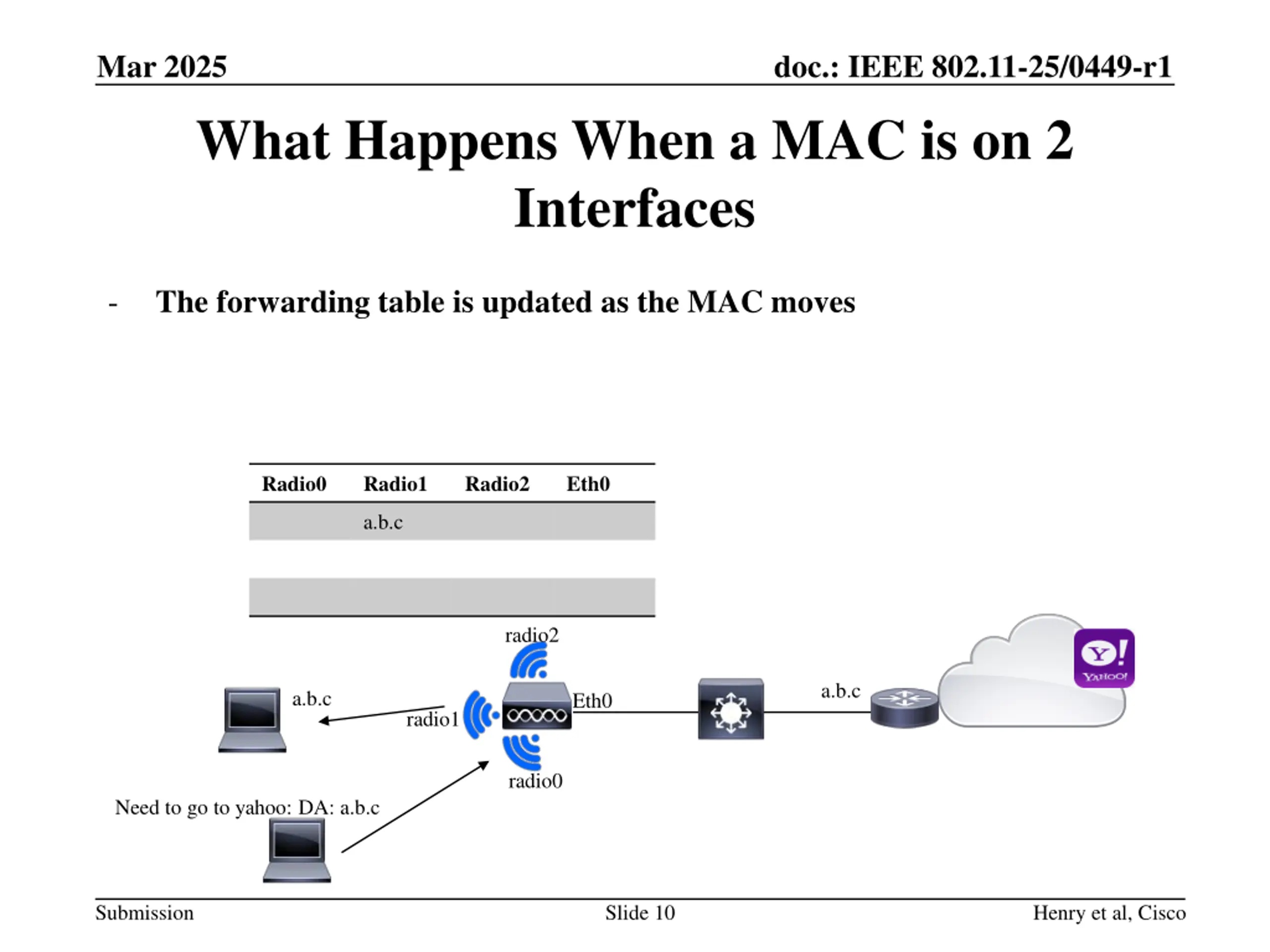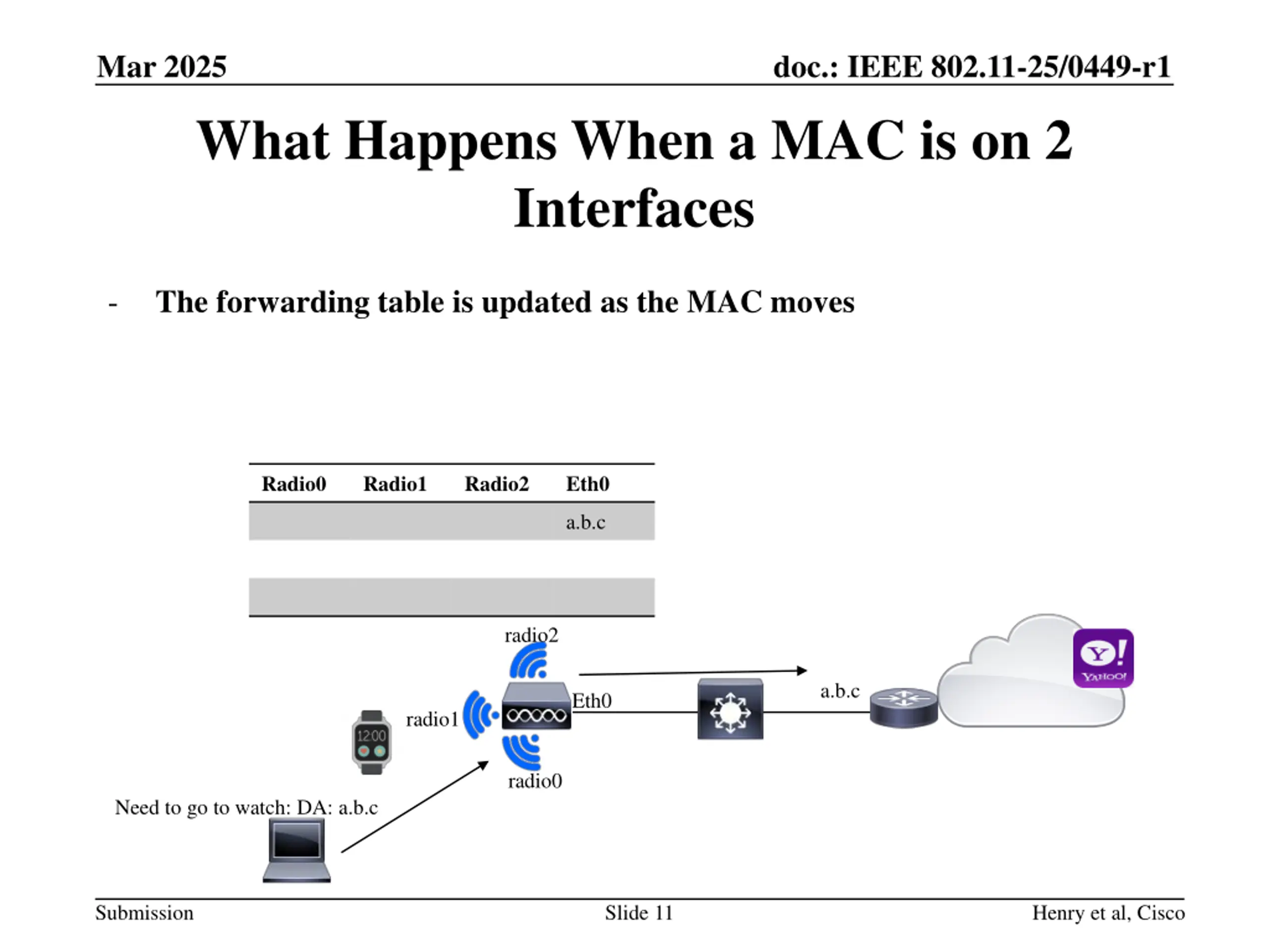 Mar 2025 doc.: IEEE 802.11-25/0449-r1 What Happens When a MAC is on 2 Interfaces The forwarding table is updated as the MAC moves - Radio0 Radio1 Radio2 Eth0 a.b.c radio2 a.b.c a.b.c Eth0 radio1 radio0 Need to go to yahoo: DA: a.b.c Submission Slide 10 Henry et al, Cisco -