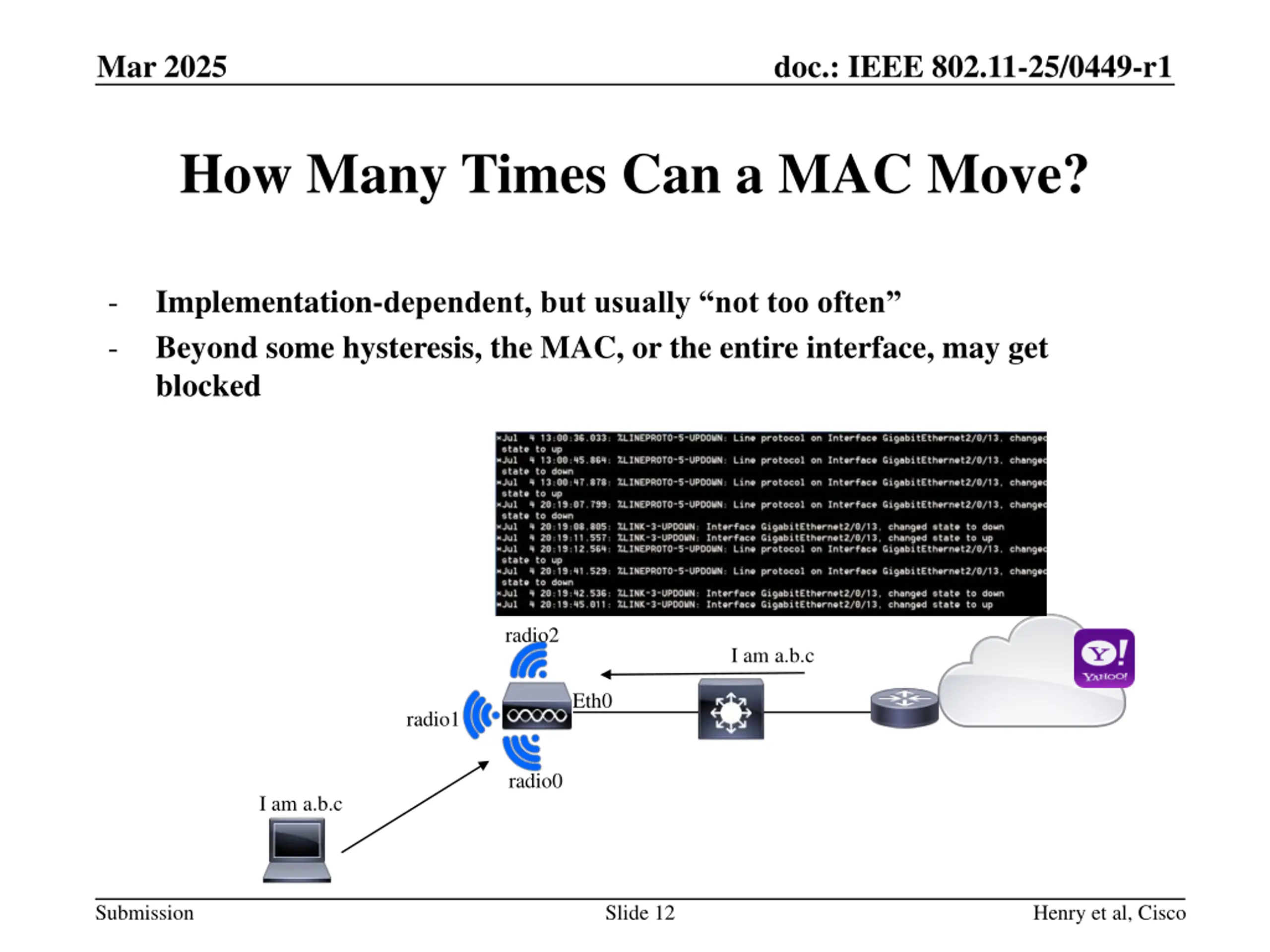 Mar 2025 doc.: IEEE 802.11-25/0449-r1 How Many Times Can a MAC Move? Implementation-dependent, but usually not too often Beyond some hysteresis, the MAC, or the entire interface, may get blocked - - radio2 I am a.b.c Eth0 radio1 radio0 I am a.b.c Submission Slide 12 Henry et al, Cisco -