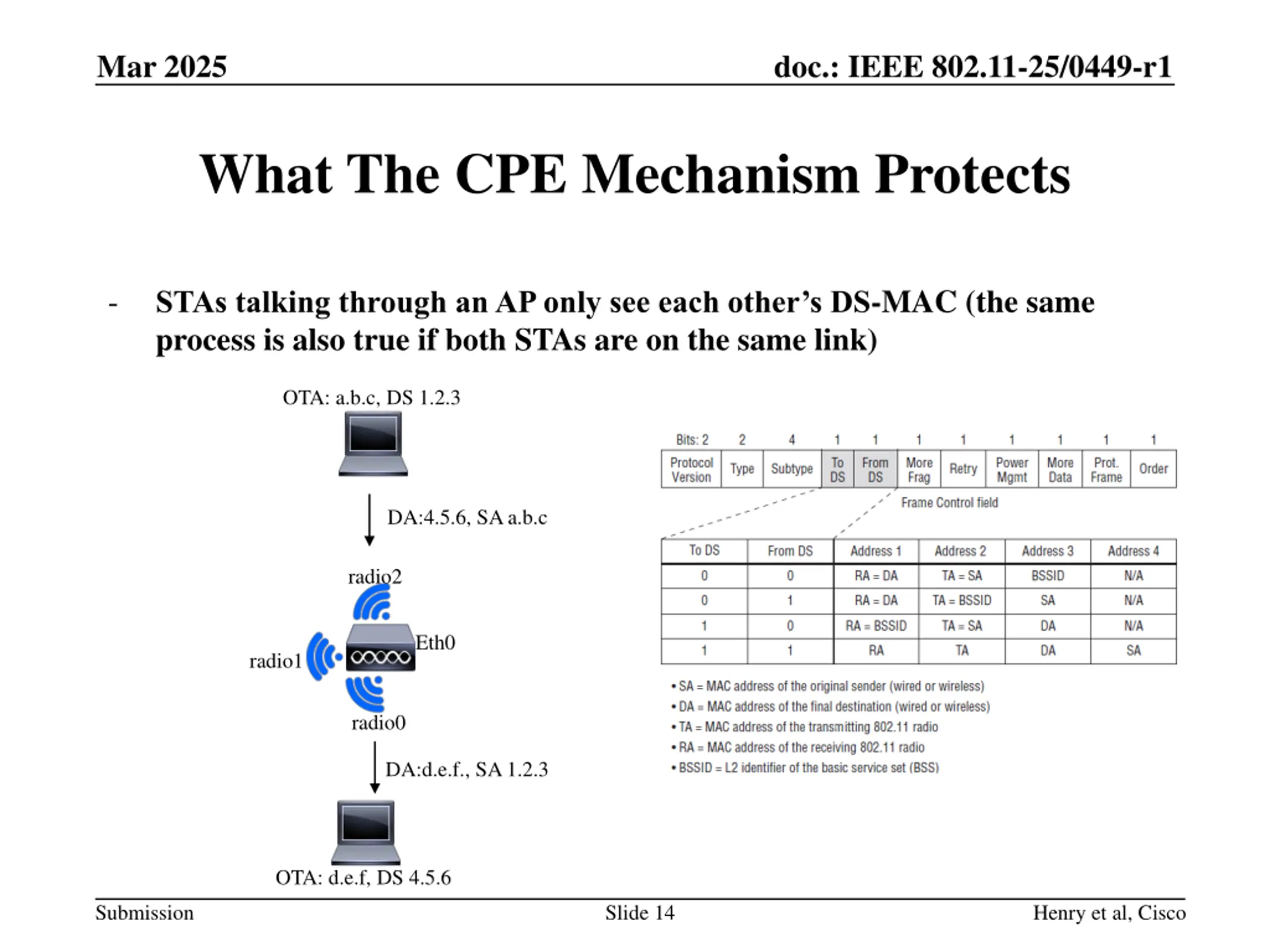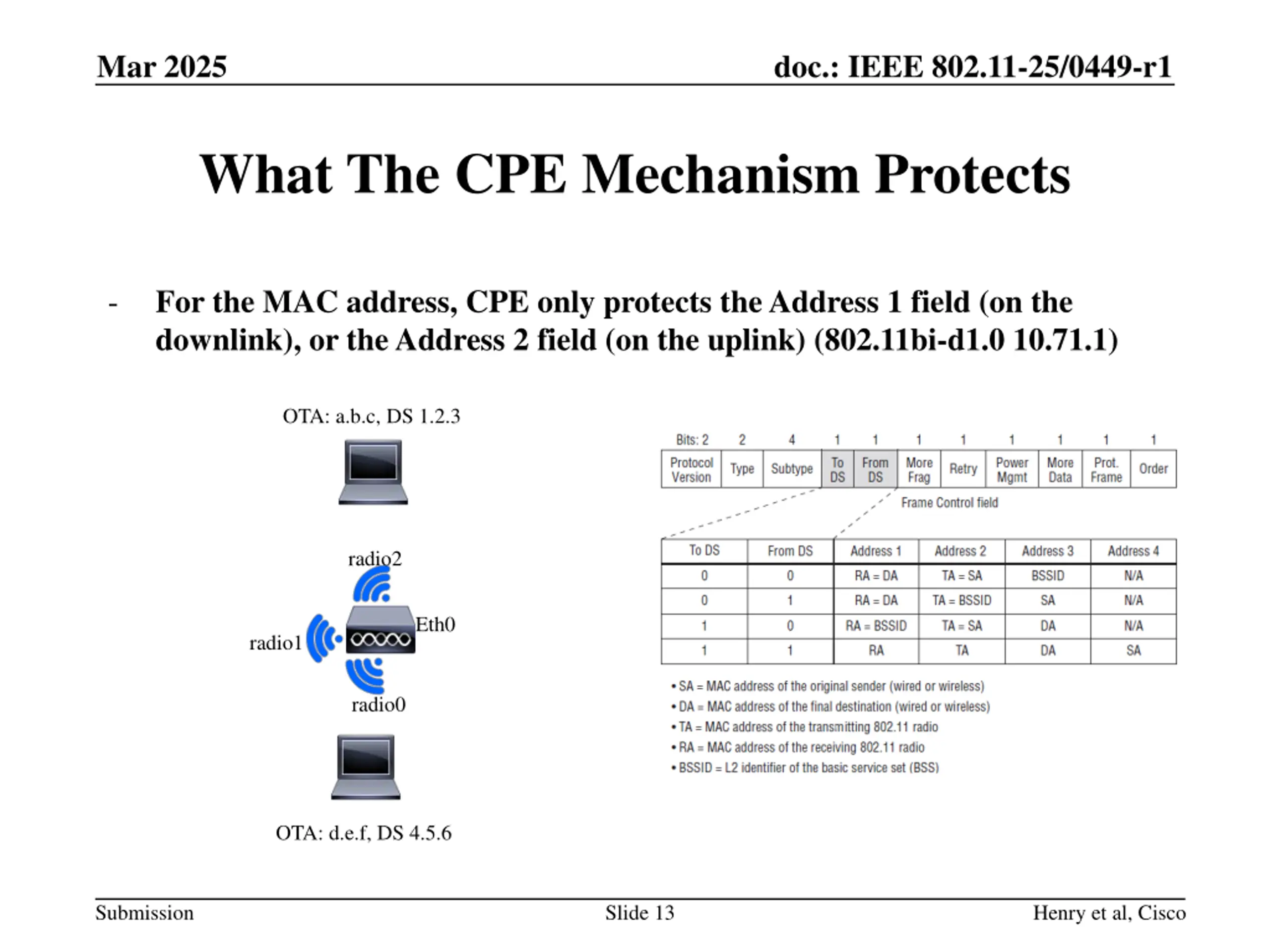 Mar 2025 doc.: IEEE 802.11-25/0449-r1 What The CPE Mechanism Protects For the MAC address, CPE only protects the Address 1 field (on the downlink), or the Address 2 field (on the uplink) (802.11bi-d1.0 10.71.1) - OTA: a.b.c, DS 1.2.3 radio2 Eth0 radio1 radio0 OTA: d.e.f, DS 4.5.6 Submission Slide 13 Henry et al, Cisco -