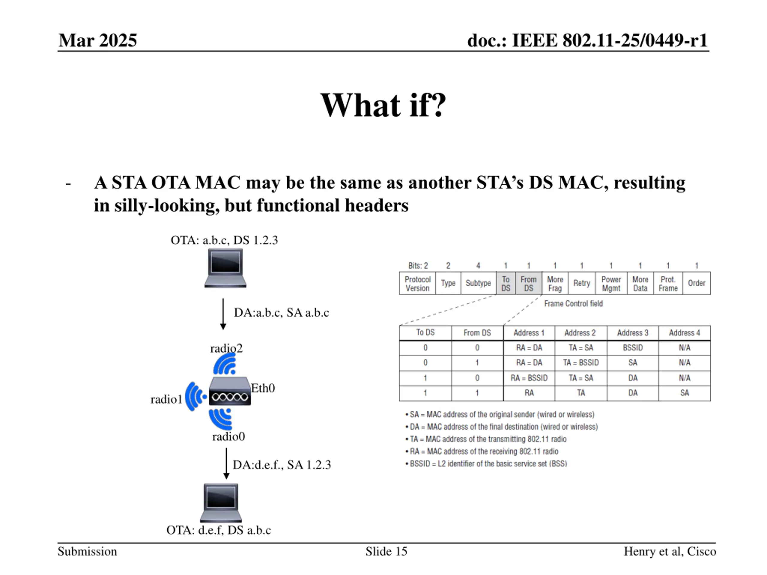 Mar 2025 doc.: IEEE 802.11-25/0449-r1 What The CPE Mechanism Protects STAs talking through an AP only see each other s DS-MAC (the same process is also true if both STAs are on the same link) - OTA: a.b.c, DS 1.2.3 DA:4.5.6, SA a.b.c radio2 Eth0 radio1 radio0 DA:d.e.f., SA 1.2.3 OTA: d.e.f, DS 4.5.6 Submission Slide 14 Henry et al, Cisco -