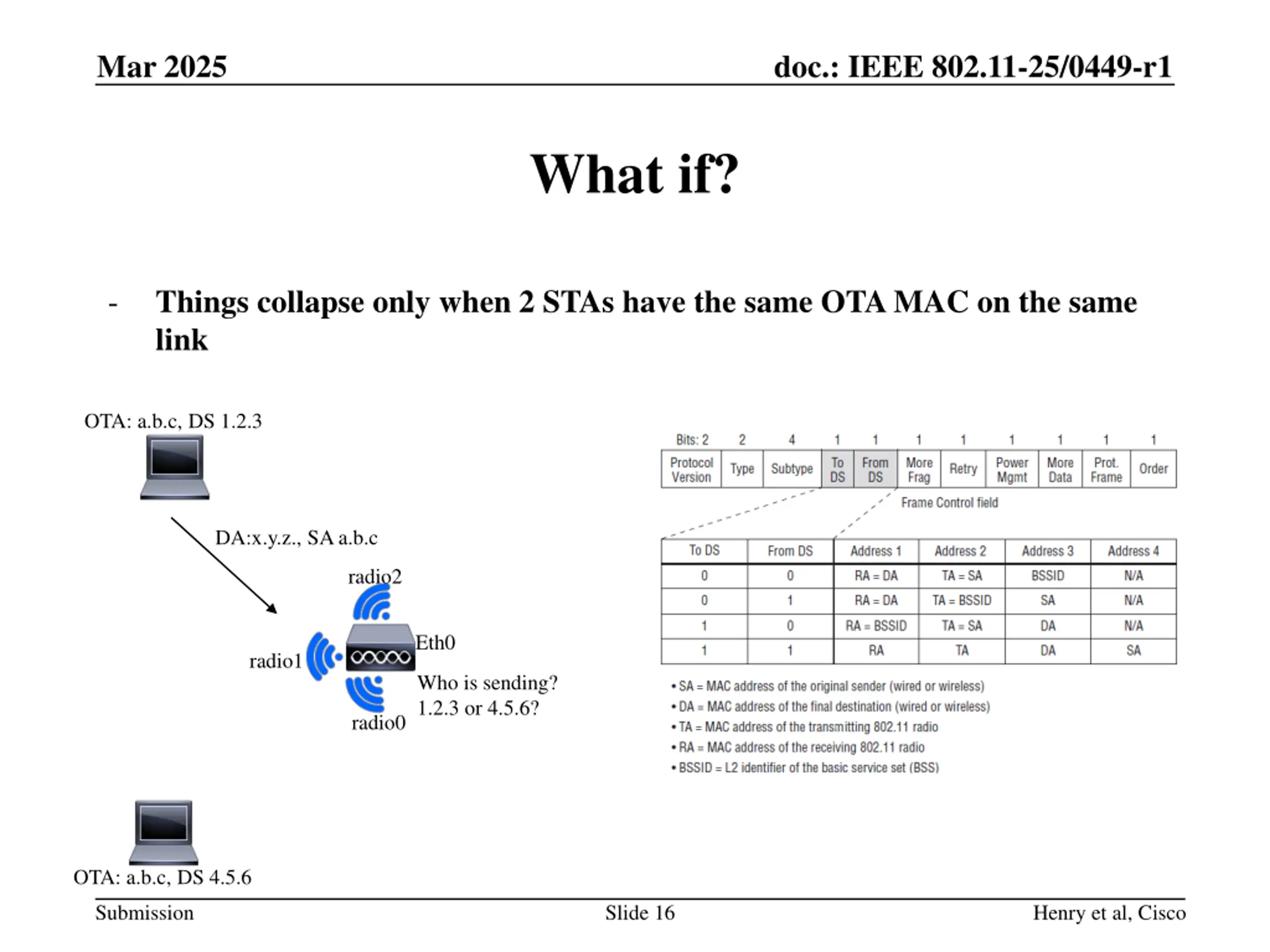 Mar 2025 doc.: IEEE 802.11-25/0449-r1 What if? - A STA OTA MAC may be the same as another STA s DS MAC, resulting in silly-looking, but functional headers OTA: a.b.c, DS 1.2.3 DA:a.b.c, SA a.b.c radio2 Eth0 radio1 radio0 DA:d.e.f., SA 1.2.3 OTA: d.e.f, DS a.b.c Submission Slide 15 Henry et al, Cisco -
