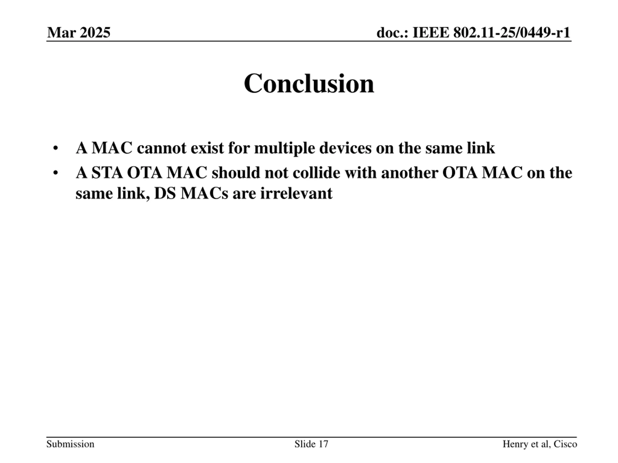 Mar 2025 doc.: IEEE 802.11-25/0449-r1 Conclusion A MAC cannot exist for multiple devices on the same link A STA OTA MAC should not collide with another OTA MAC on the same link, DS MACs are irrelevant Submission Slide 17 Henry et al, Cisco -
