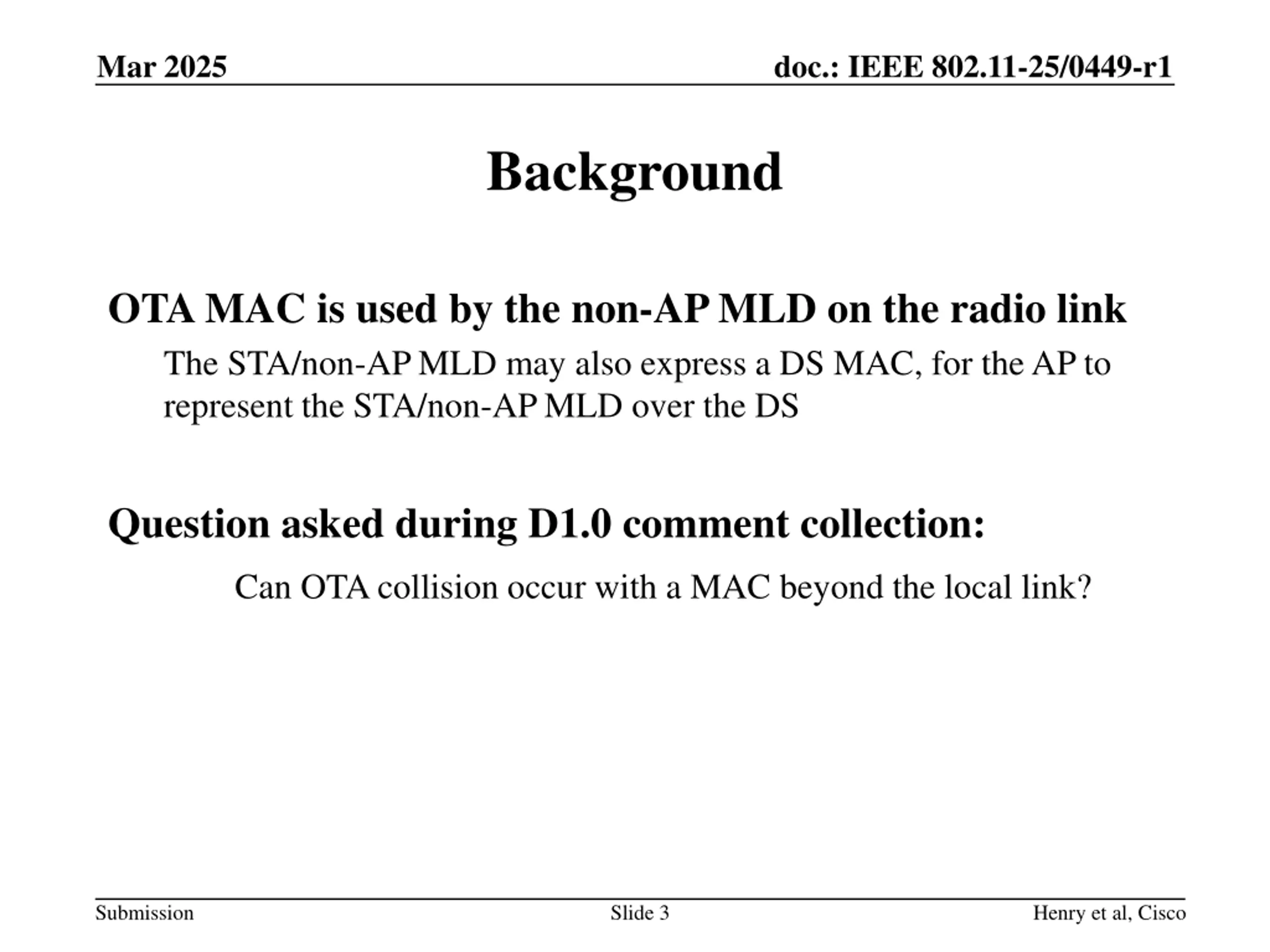 Mar 2025 doc.: IEEE 802.11-25/0449-r1 Background OTA MAC is used by the non-AP MLD on the radio link The STA/non-AP MLD may also express a DS MAC, for the AP to represent the STA/non-AP MLD over the DS Question asked during D1.0 comment collection: Can OTA collision occur with a MAC beyond the local link? Submission Slide 3 Henry et al, Cisco -