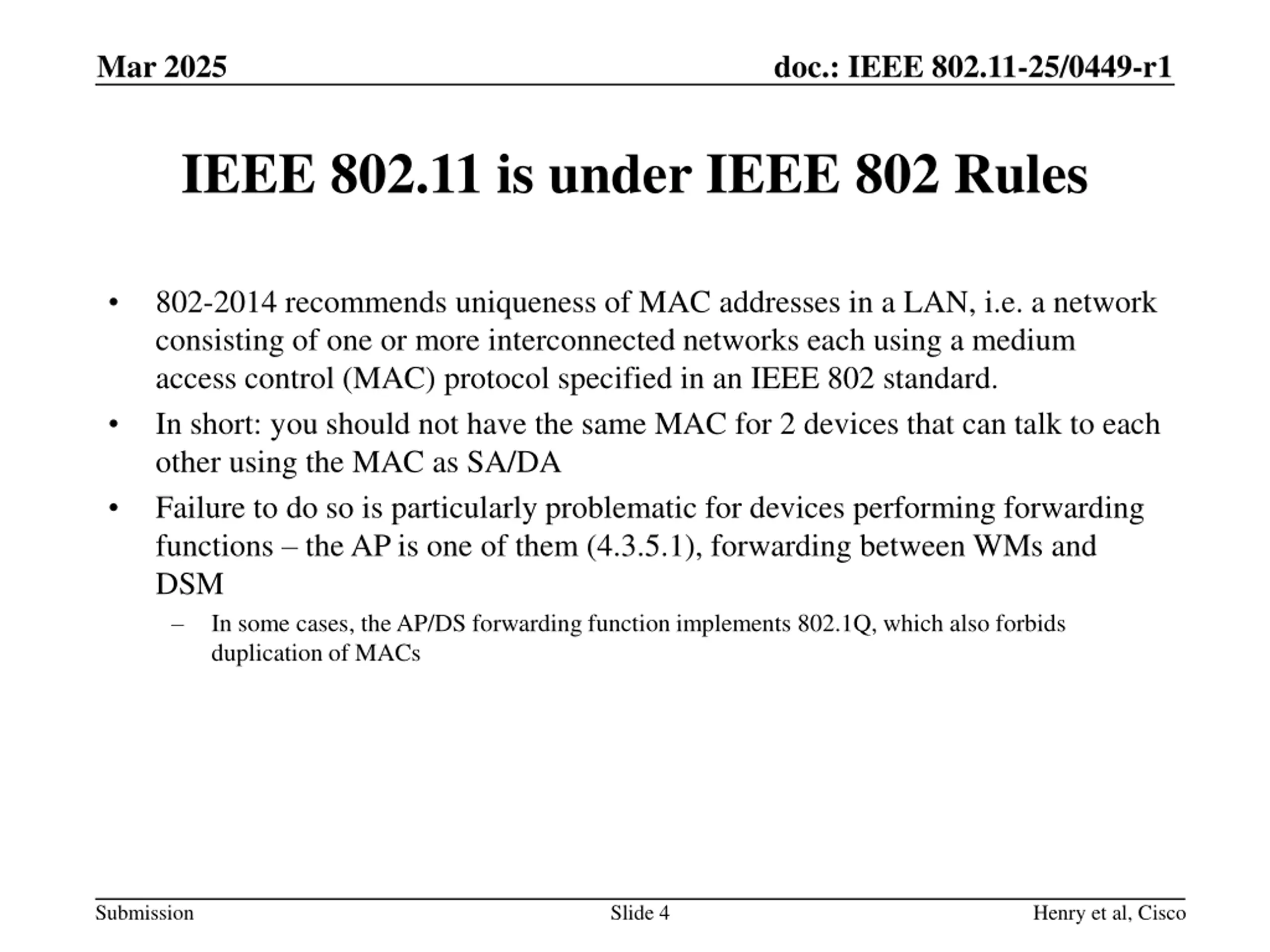 Mar 2025 doc.: IEEE 802.11-25/0449-r1 IEEE 802.11 is under IEEE 802 Rules 802-2014 recommends uniqueness of MAC addresses in a LAN, i.e. a network consisting of one or more interconnected networks each using a medium access control (MAC) protocol specified in an IEEE 802 standard. In short: you should not have the same MAC for 2 devices that can talk to each other using the MAC as SA/DA Failure to do so is particularly problematic for devices performing forwarding functions the AP is one of them (4.3.5.1), forwarding between WMs and DSM In some cases, the AP/DS forwarding function implements 802.1Q, which also forbids duplication of MACs Submission Slide 4 Henry et al, Cisco -