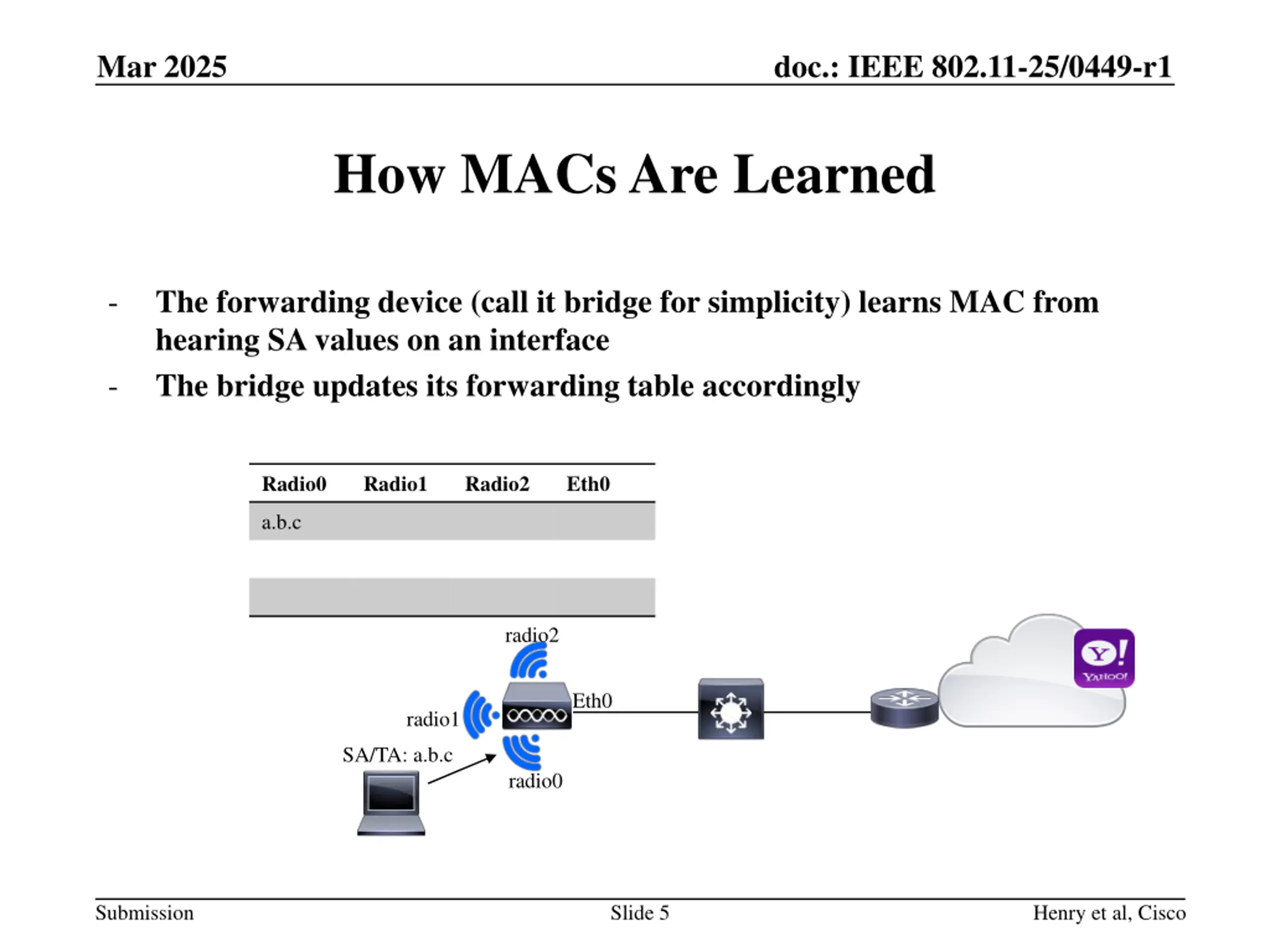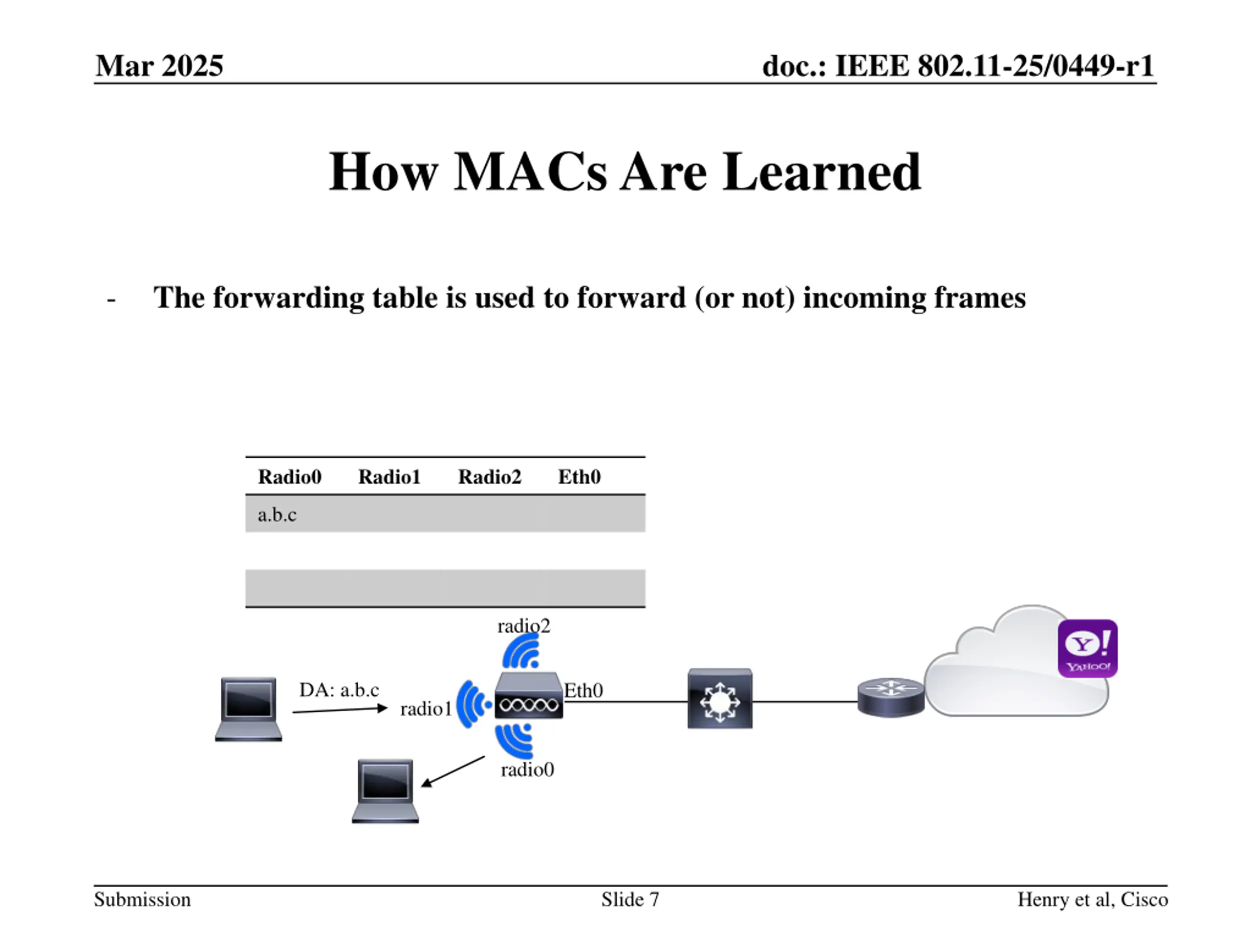 Mar 2025 doc.: IEEE 802.11-25/0449-r1 How MACs Are Learned The forwarding device (call it bridge for simplicity) learns MAC from hearing SA values on an interface The bridge updates its forwarding table accordingly - - Radio0 Radio1 Radio2 Eth0 a.b.c radio2 Eth0 radio1 SA/TA: a.b.c radio0 Submission Slide 6 Henry et al, Cisco -