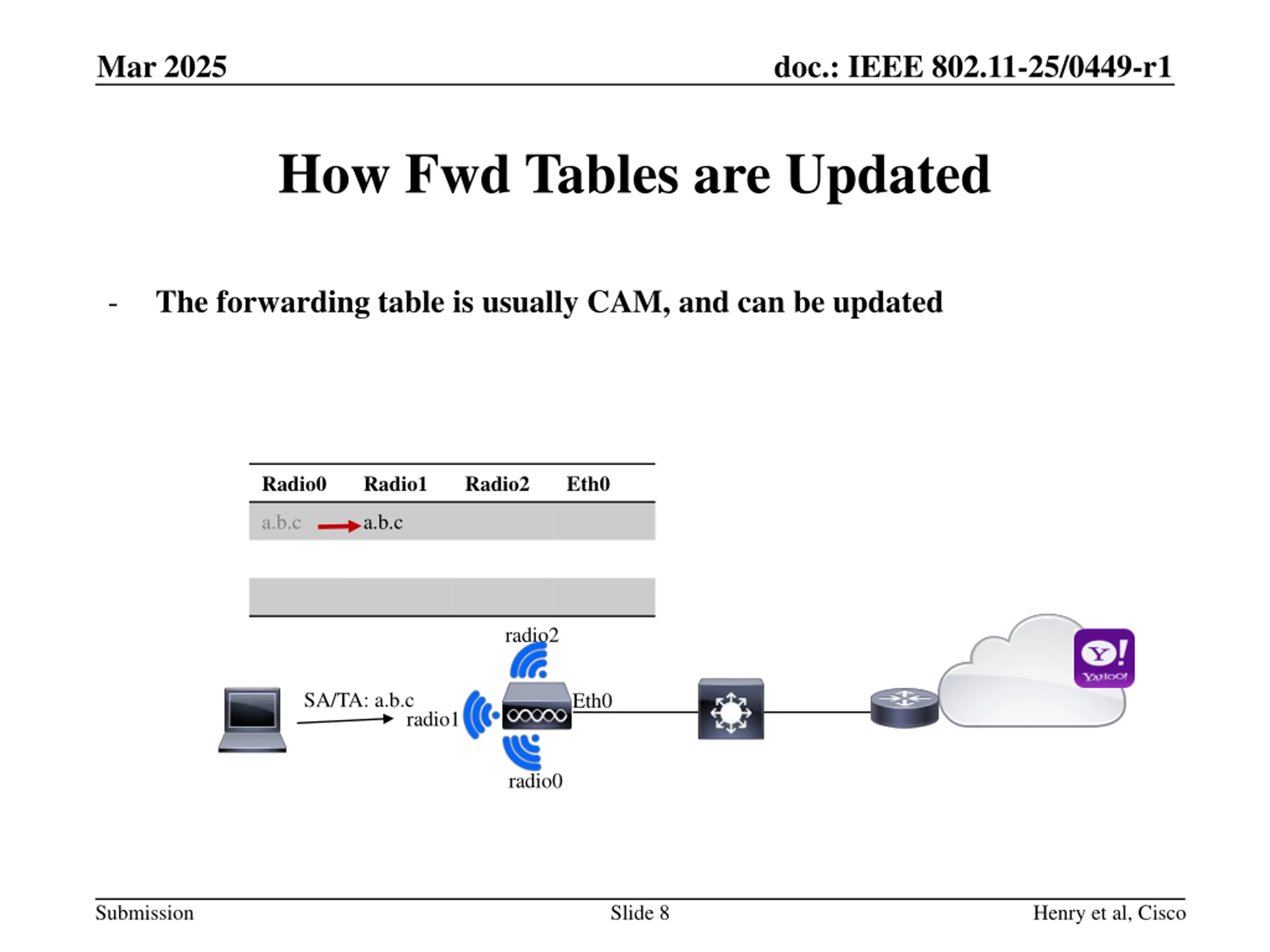 Mar 2025 doc.: IEEE 802.11-25/0449-r1 How MACs Are Learned The forwarding table is used to forward (or not) incoming frames - Radio0 Radio1 Radio2 Eth0 a.b.c radio2 DA: a.b.c Eth0 radio1 radio0 Submission Slide 7 Henry et al, Cisco -