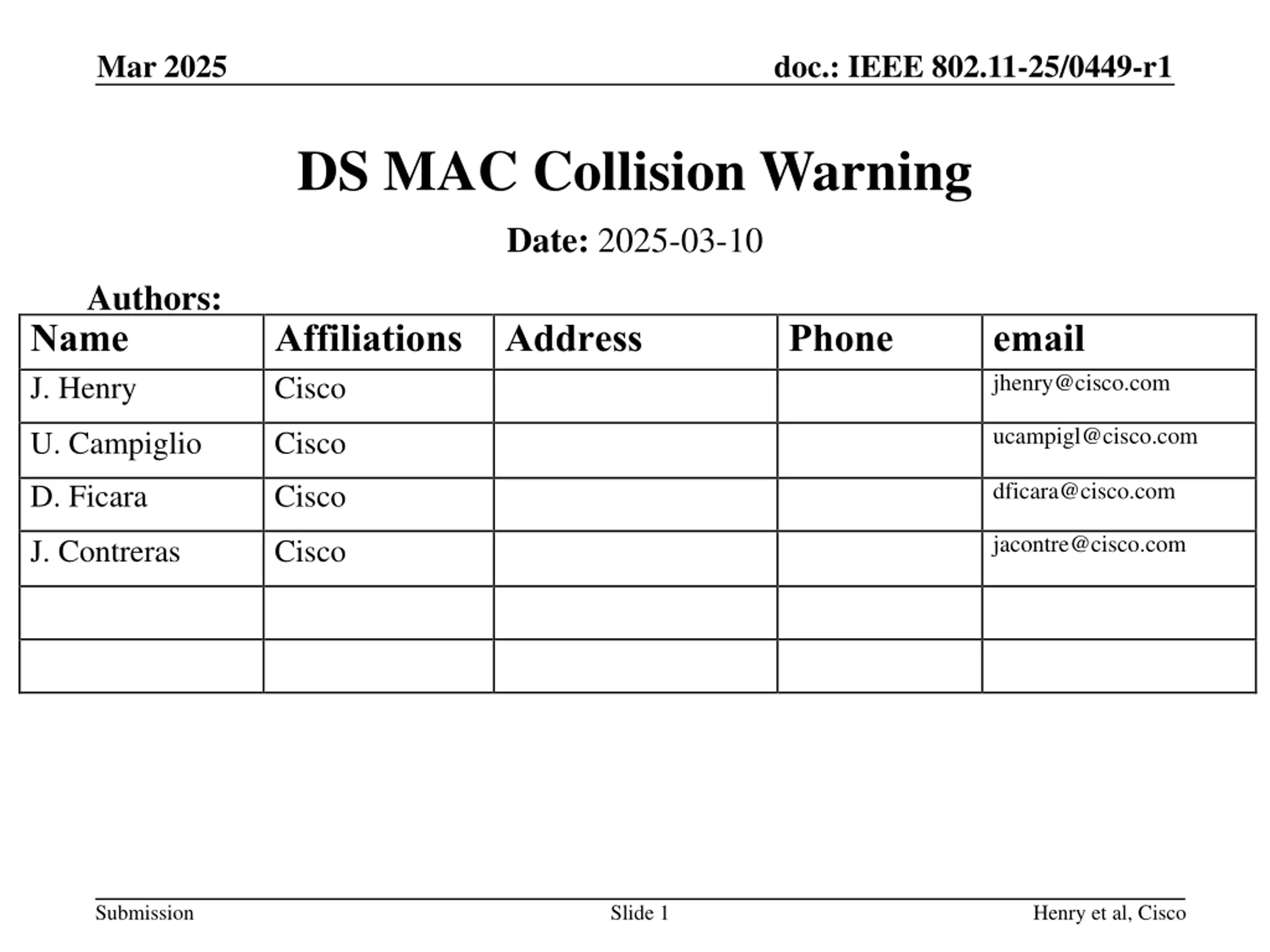 Mar 2025 doc.: IEEE 802.11-25/0449-r1 DS MAC Collision Warning Date: 2025-03-10 Authors: Name J. Henry Affiliations Address Cisco Phone email jhenry@cisco.com ucampigl@cisco.com U. Campiglio Cisco dficara@cisco.com D. Ficara Cisco jacontre@cisco.com J. Contreras Cisco Submission Slide 1 Henry et al, Cisco -