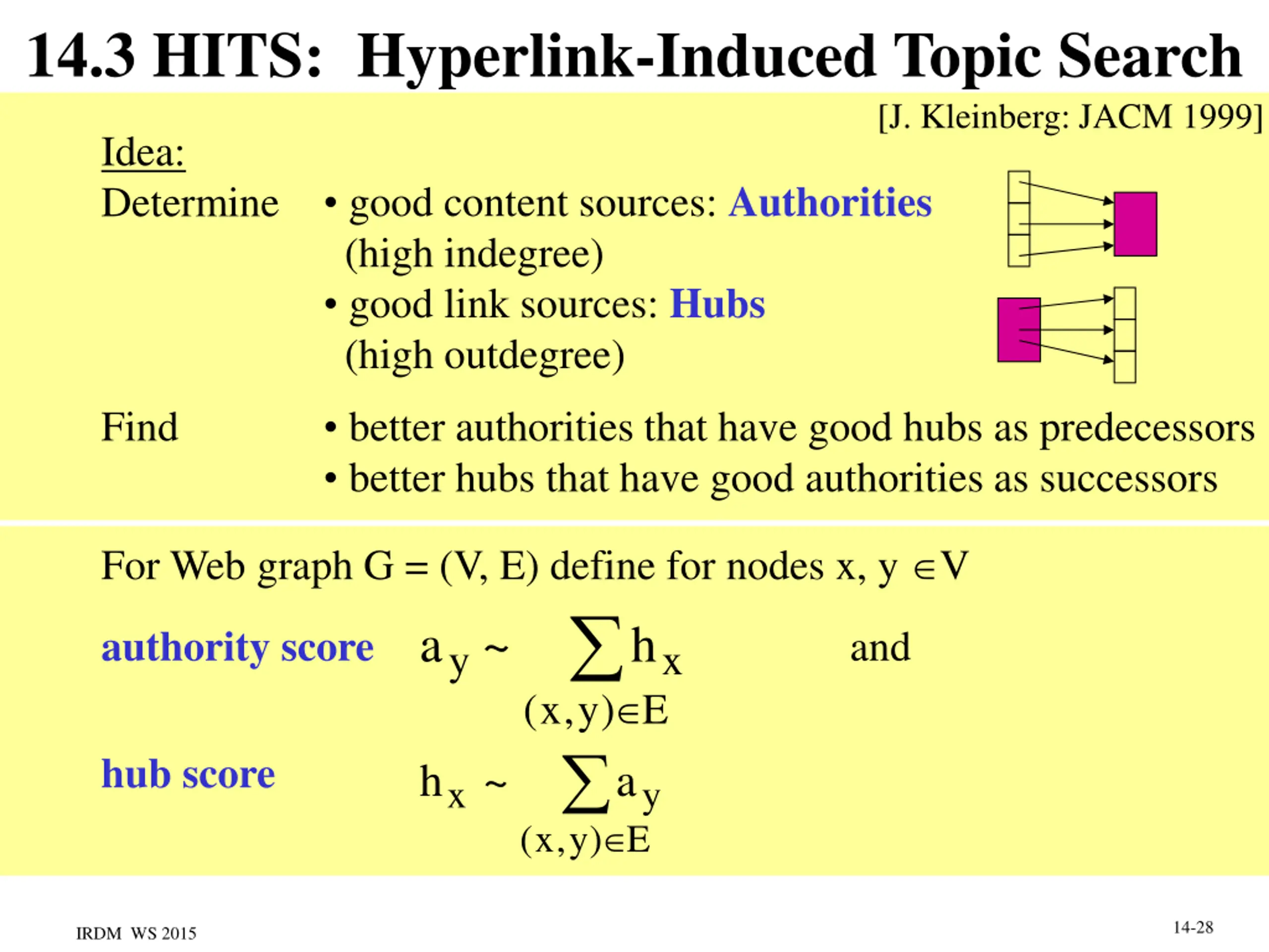 14.3 HITS: Hyperlink-Induced Topic Search [J. Kleinberg: JACM 1999] Idea: Determine good content sources: Authorities (high indegree) good link sources: Hubs (high outdegree) Find better authorities that have good hubs as predecessors better hubs that have good authorities as successors For Web graph G = (V, E) define for nodes x, y V authority score and y ~ a h x E a ) y , x ( ) y , x ( hub score h ~ x y E 14-28 IRDM WS 2015