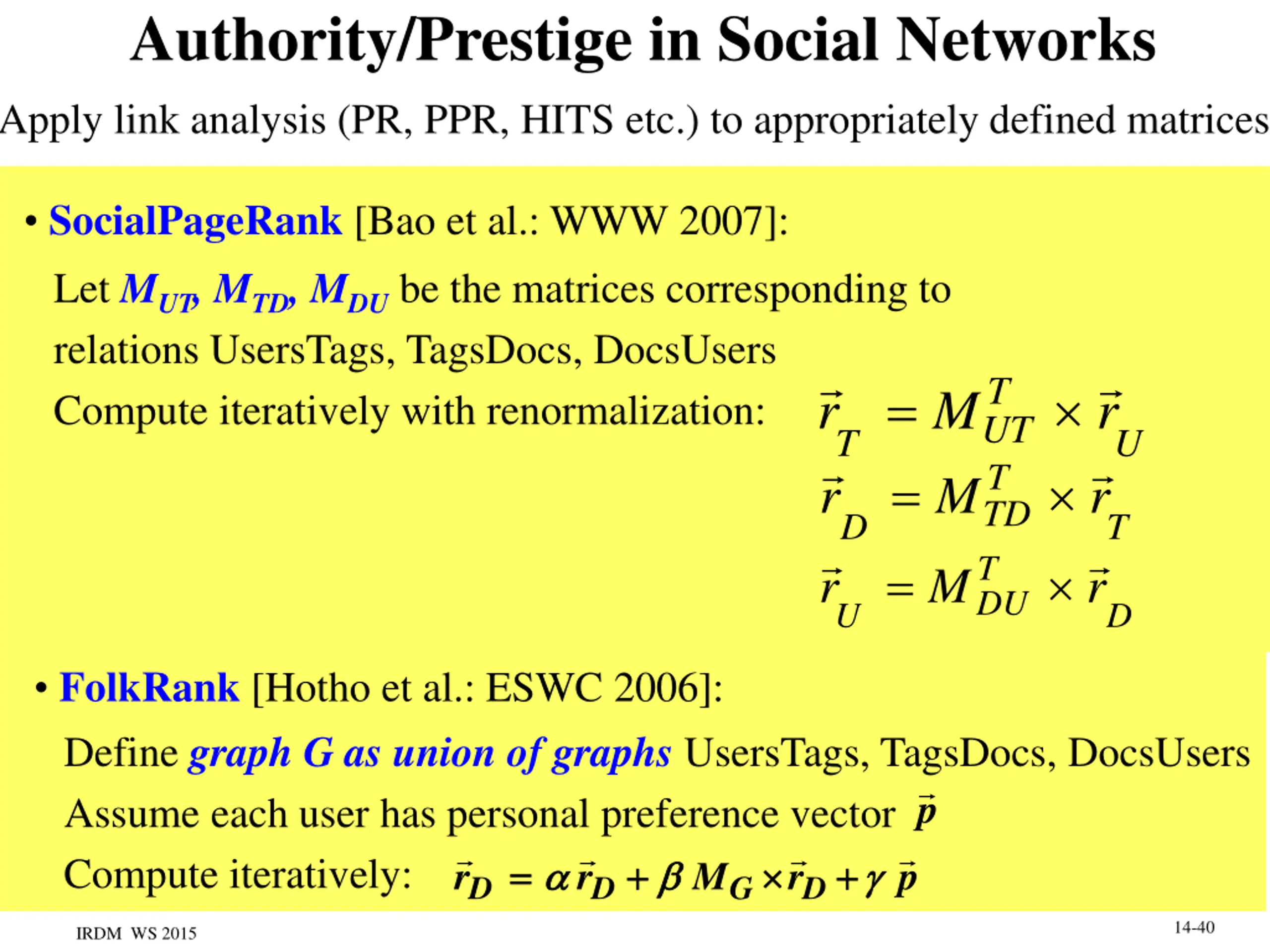 Authority/Prestige in Social Networks Apply link analysis (PR, PPR, HITS etc.) to appropriately defined matrices SocialPageRank [Bao et al.: WWW 2007]: Let MUT, MTD, MDUbe the matrices corresponding to relations UsersTags, TagsDocs, DocsUsers Compute iteratively with renormalization: T UT = r M r T U T TD = r M r D T T DU = r M r U D FolkRank [Hotho et al.: ESWC 2006]: Define graph G as union of graphs UsersTags, TagsDocs, DocsUsers Assume each user has personal preference vector Compute iteratively: r r D D + + = = p + + M r p G D 14-40 IRDM WS 2015