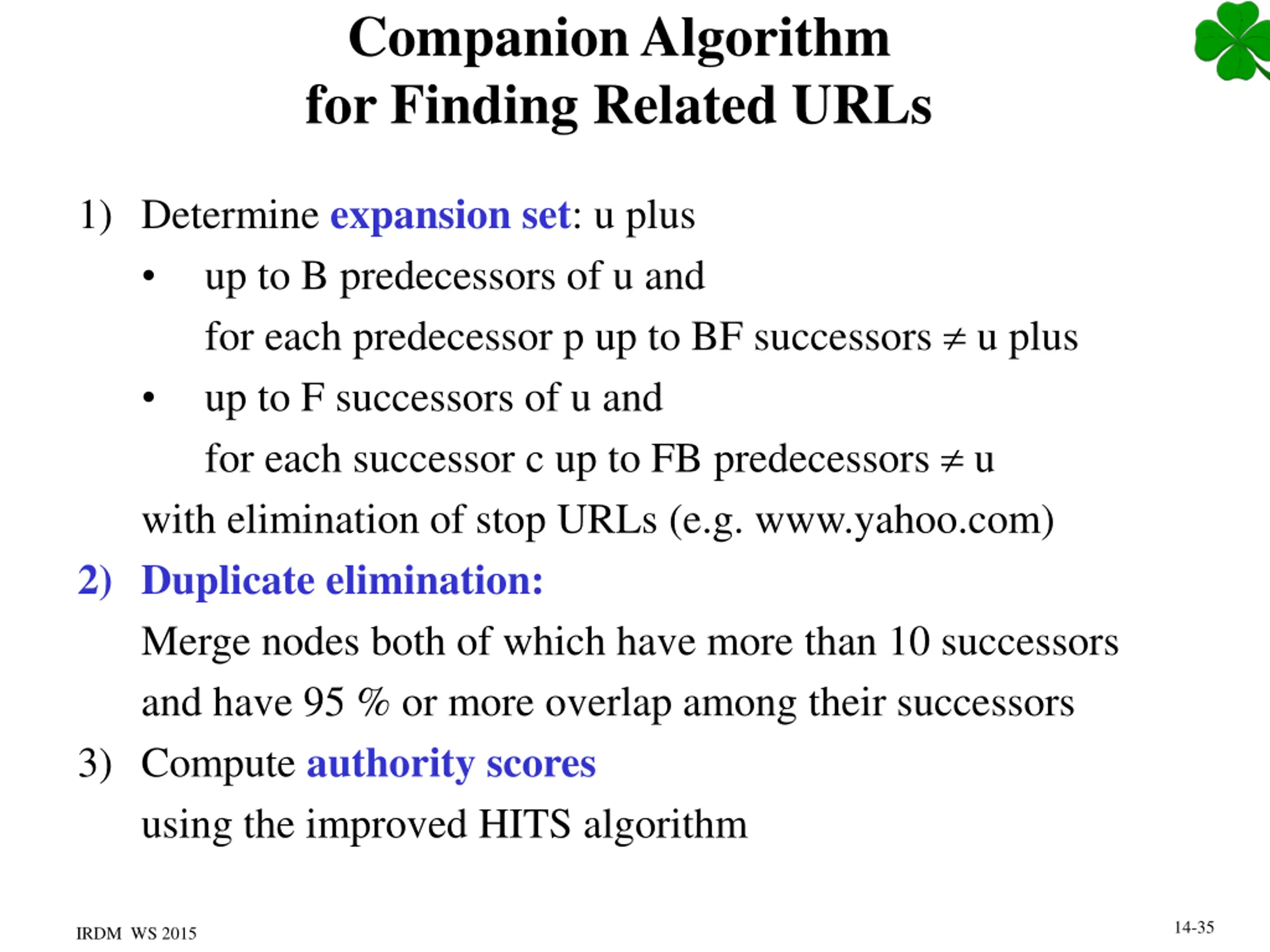 Companion Algorithm for Finding Related URLs 1) Determine expansion set: u plus up to B predecessors of u and for each predecessor p up to BF successors u plus up to F successors of u and for each successor c up to FB predecessors u with elimination of stop URLs (e.g. www.yahoo.com) 2) Duplicate elimination: Merge nodes both of which have more than 10 successors and have 95 % or more overlap among their successors 3) Compute authority scores using the improved HITS algorithm 14-35 IRDM WS 2015