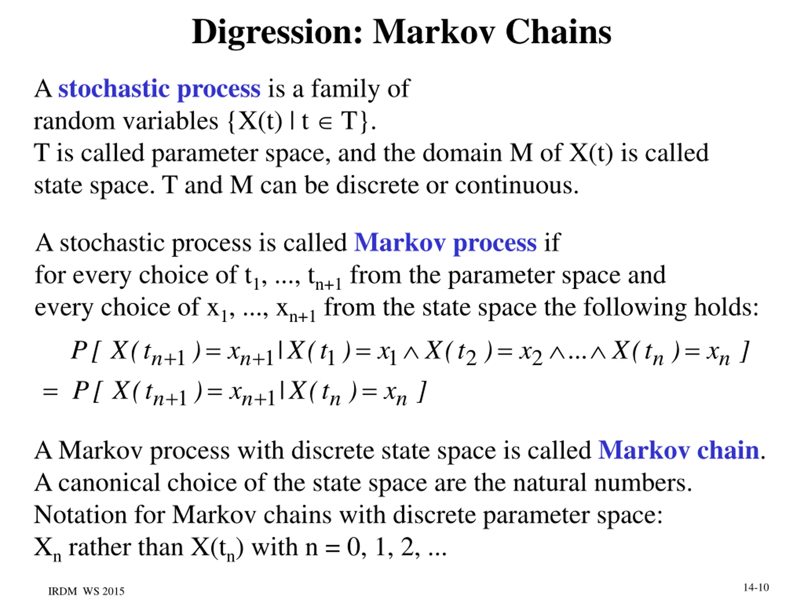 Digression: Markov Chains A stochastic process is a family of random variables {X(t) | t T}. T is called parameter space, and the domain M of X(t) is called state space. T and M can be discrete or continuous. A stochastic process is called Markov process if for every choice of t1, ..., tn+1 from the parameter space and every choice of x1, ..., xn+1 from the state space the following holds: x ) t ( X | x ) t ( X [ P n n = = + + 1 1 1 1 x ) t ( X | x ) t ( X [ P n n n n = = = + + 1 1 = = X t ( ) x ... X t ( ) x ] 2 2 n n ] A Markov process with discrete state space is called Markov chain. A canonical choice of the state space are the natural numbers. Notation for Markov chains with discrete parameter space: Xn rather than X(tn) with n = 0, 1, 2, ... 14-10 IRDM WS 2015