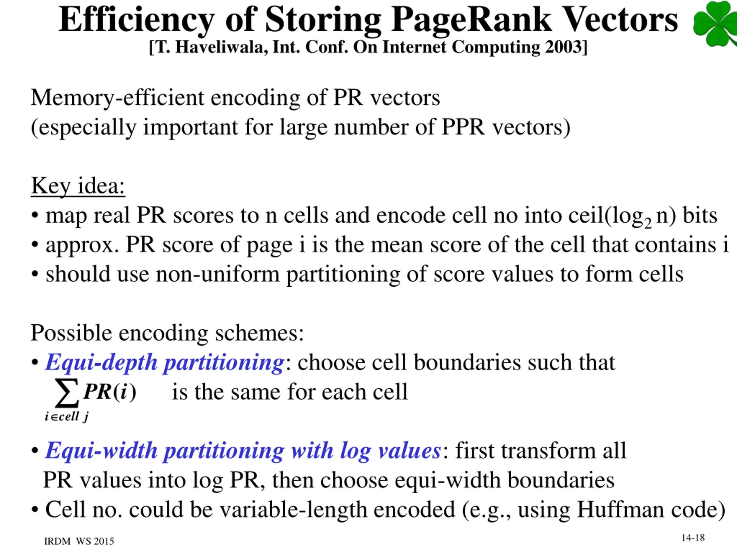 Efficiency of Storing PageRank Vectors [T. Haveliwala, Int. Conf. On Internet Computing 2003] Memory-efficient encoding of PR vectors (especially important for large number of PPR vectors) Key idea: map real PR scores to n cells and encode cell no into ceil(log2 n) bits approx. PR score of page i is the mean score of the cell that contains i should use non-uniform partitioning of score values to form cells Possible encoding schemes: Equi-depth partitioning: choose cell boundaries such that is the same for each cell j cell i PR ) i ( Equi-width partitioning with log values: first transform all PR values into log PR, then choose equi-width boundaries Cell no. could be variable-length encoded (e.g., using Huffman code) 14-18 IRDM WS 2015