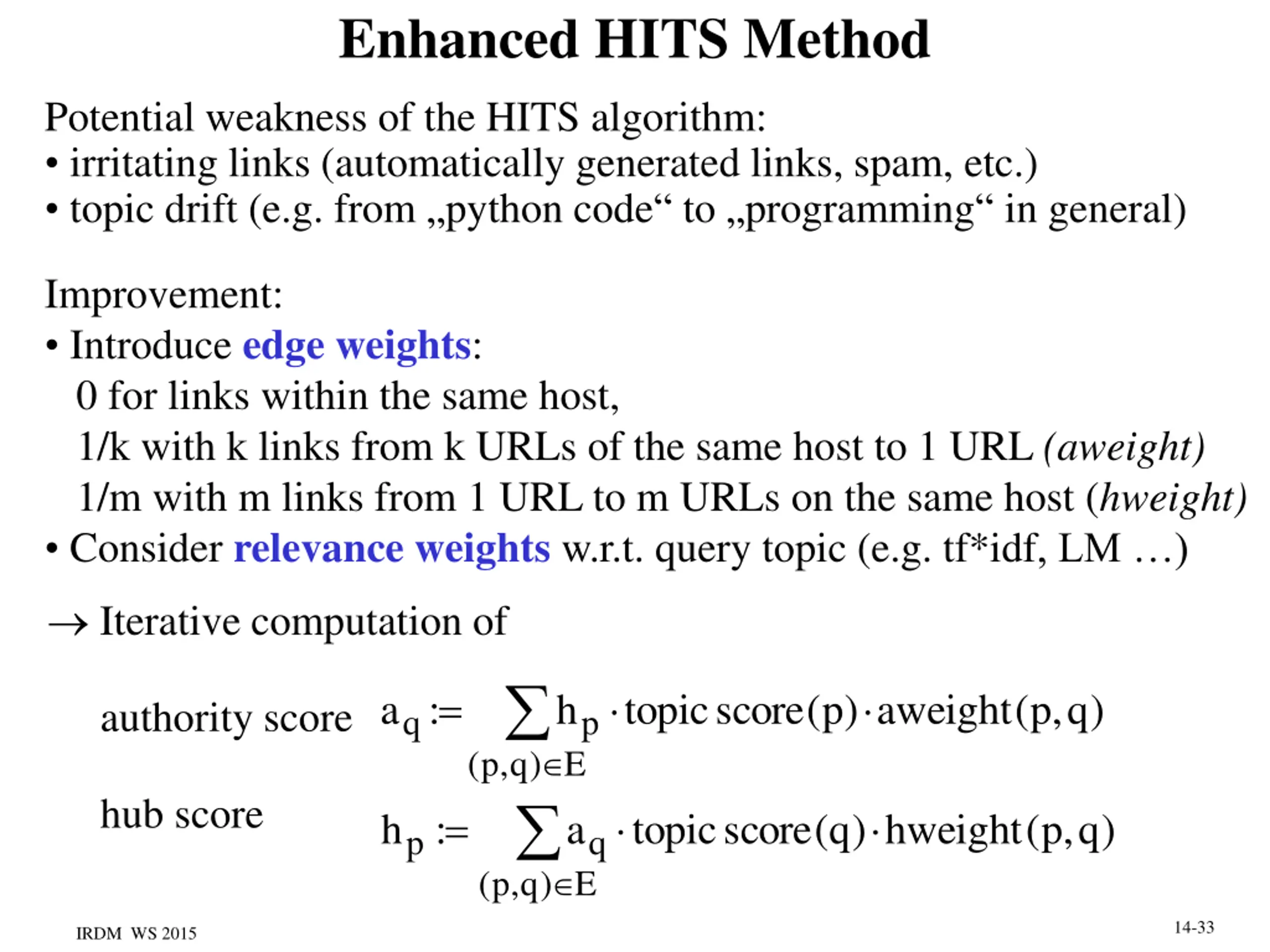 Enhanced HITS Method Potential weakness of the HITS algorithm: irritating links (automatically generated links, spam, etc.) topic drift (e.g. from python code to programming in general) Improvement: Introduce edge weights: 0 for links within the same host, 1/k with k links from k URLs of the same host to 1 URL (aweight) 1/m with m links from 1 URL to m URLs on the same host (hweight) Consider relevance weights w.r.t. query topic (e.g. tf*idf, LM ) Iterative computation of = a : h E a topic score ) p ( aweight ) q , p ( authority score q p ) q , p ( = hub score h : topic score ) q ( hweight ) q , p ( p q ) q , p ( E 14-33 IRDM WS 2015