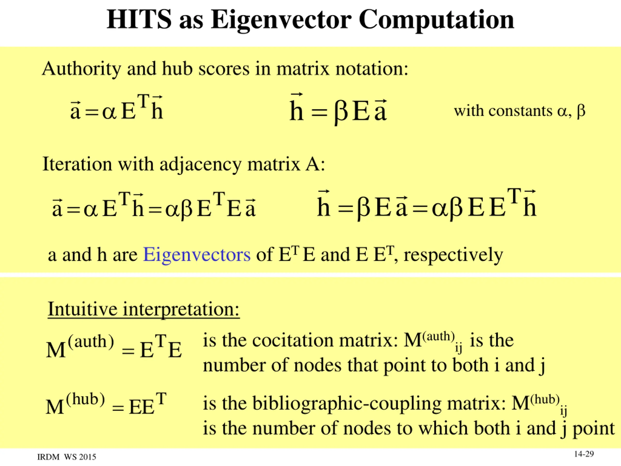 HITS as Eigenvector Computation Authority and hub scores in matrix notation: T = = h E a a E h with constants , Iteration with adjacency matrix A: = = T T T = = h E a E E h a E h E E a a and h are Eigenvectors of ET E and E ET, respectively Intuitive interpretation: is the cocitation matrix: M(auth)ij is the number of nodes that point to both i and j ( auth ) T = M E E ( hub ) T is the bibliographic-coupling matrix: M(hub)ij is the number of nodes to which both i and j point = M EE 14-29 IRDM WS 2015