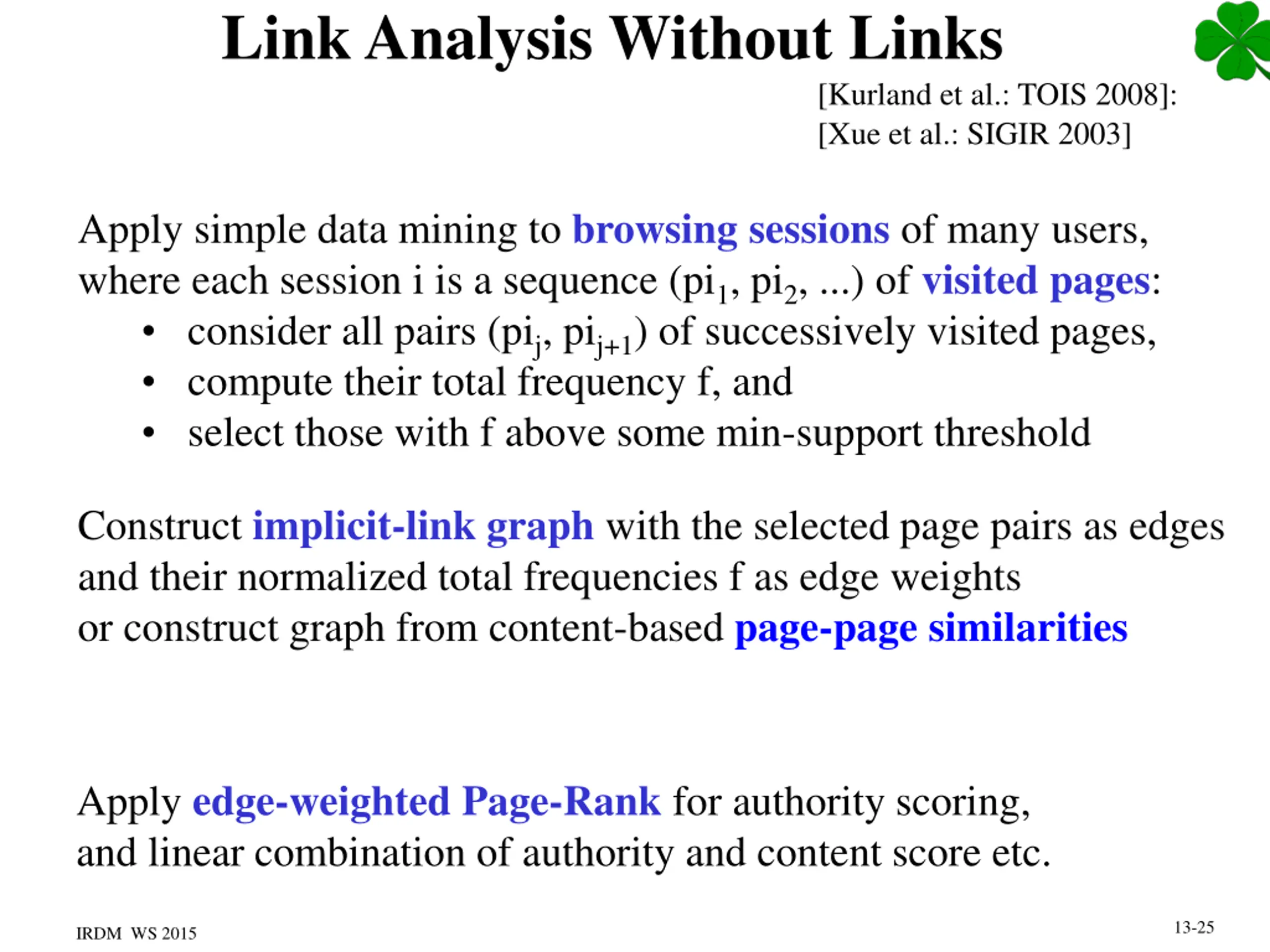 Link Analysis Without Links [Kurland et al.: TOIS 2008]: [Xue et al.: SIGIR 2003] Apply simple data mining to browsing sessions of many users, where each session i is a sequence (pi1, pi2, ...) of visited pages: consider all pairs (pij, pij+1) of successively visited pages, compute their total frequency f, and select those with f above some min-support threshold Construct implicit-link graph with the selected page pairs as edges and their normalized total frequencies f as edge weights or construct graph from content-based page-page similarities Apply edge-weighted Page-Rank for authority scoring, and linear combination of authority and content score etc. 13-25 IRDM WS 2015