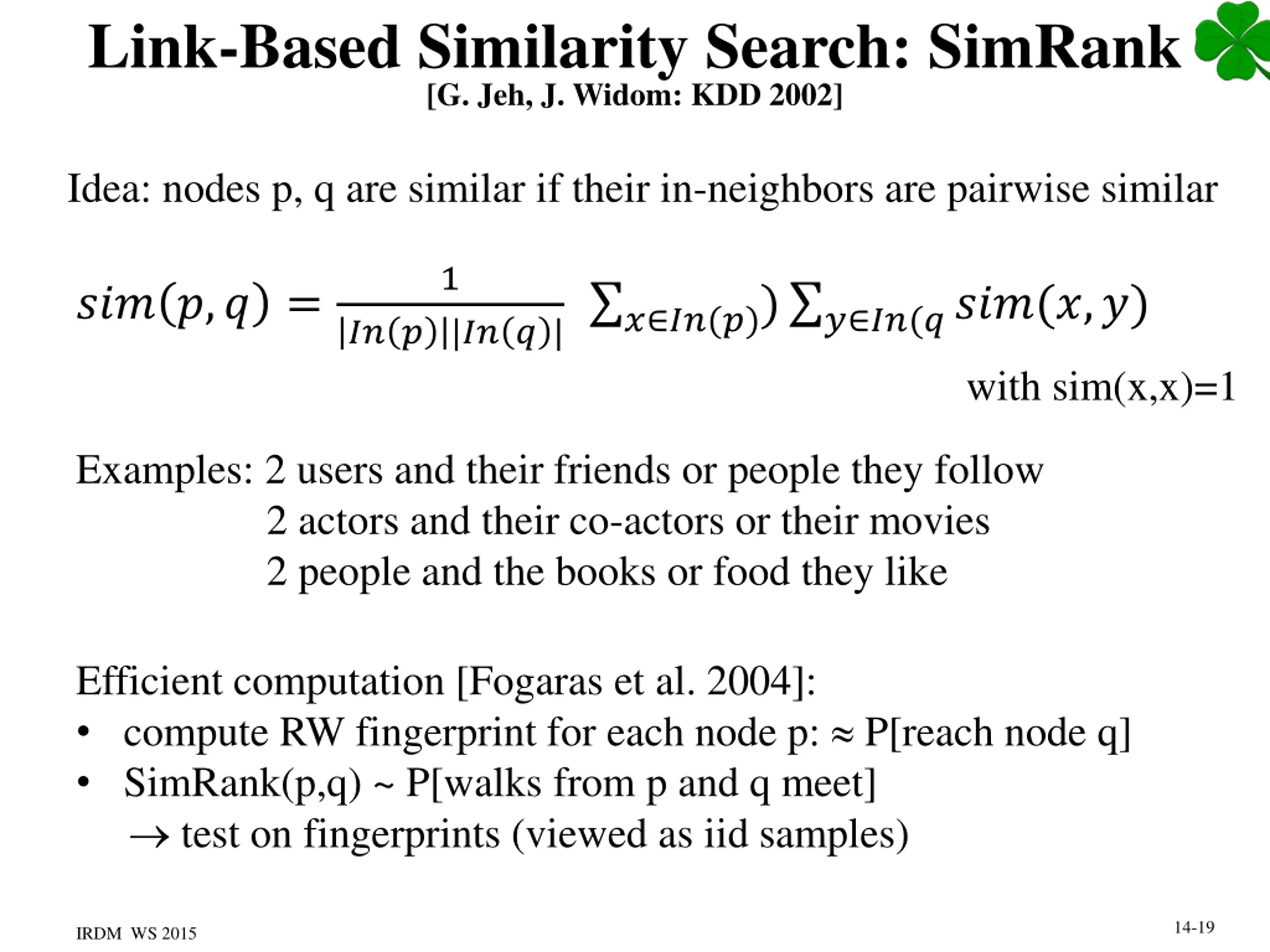 Link-Based Similarity Search: SimRank [G. Jeh, J. Widom: KDD 2002] Idea: nodes p, q are similar if their in-neighbors are pairwise similar 1 ?? ? |?? ? | ? ??(?)) ? ??(????(?,?) ??? ?,? = with sim(x,x)=1 Examples: 2 users and their friends or people they follow 2 actors and their co-actors or their movies 2 people and the books or food they like Efficient computation [Fogaras et al. 2004]: compute RW fingerprint for each node p: P[reach node q] SimRank(p,q) ~ P[walks from p and q meet] test on fingerprints (viewed as iid samples) 14-19 IRDM WS 2015