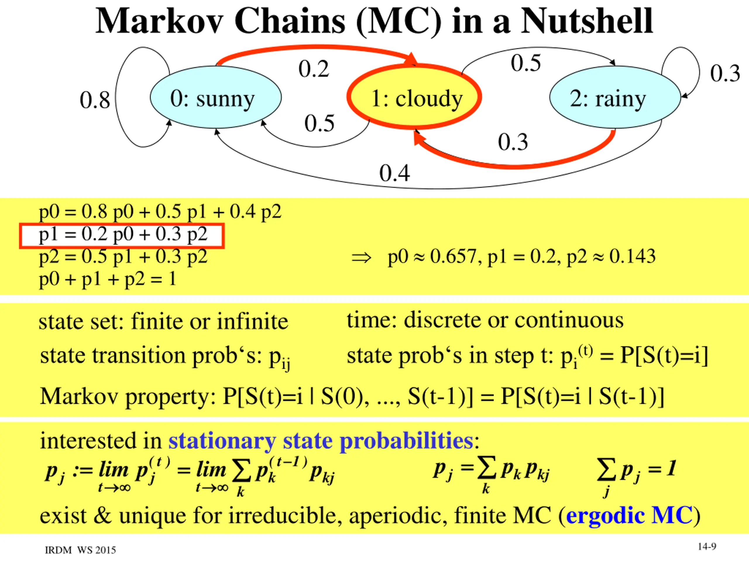 Results on Markov Chains with Discrete Parameter Space (2) Theorem: Every homogeneous, irreducible, aperiodic Markov chain with a finite number of states is ergodic. For every ergodic Markov chain there exist stationary state probabilities These are independent of (0) and are the solutions of the following system of linear equations: j all for p i = j in matrix notation: = 1 1= ( j n ) = : lim j n = (balance equations) j i ij 1 j P (with 1 n row vector ) 14-14 IRDM WS 2015