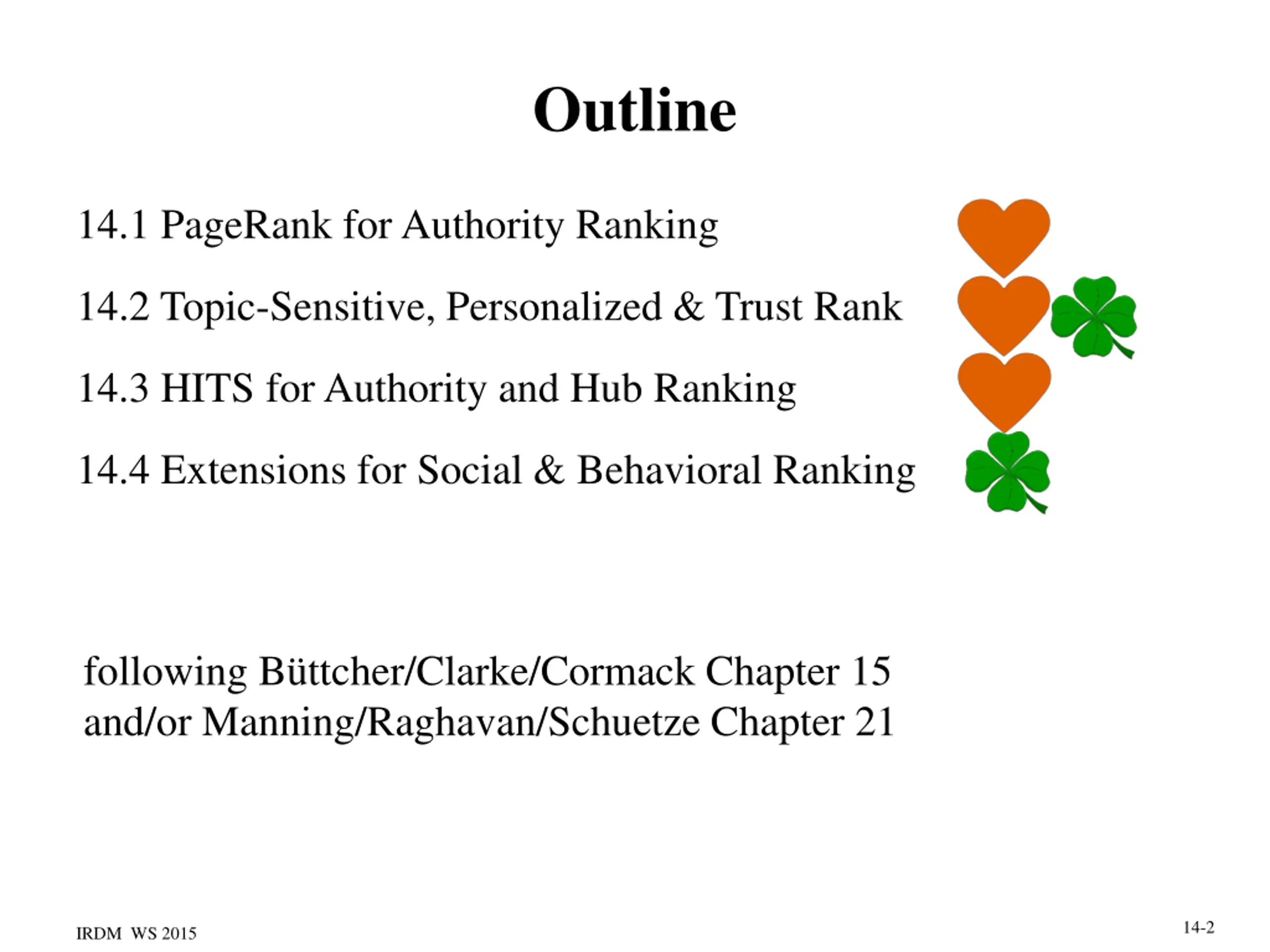 Outline 14.1 PageRank for Authority Ranking 14.2 Topic-Sensitive, Personalized & Trust Rank 14.3 HITS for Authority and Hub Ranking 14.4 Extensions for Social & Behavioral Ranking following B ttcher/Clarke/Cormack Chapter 15 and/or Manning/Raghavan/Schuetze Chapter 21 14-2 IRDM WS 2015