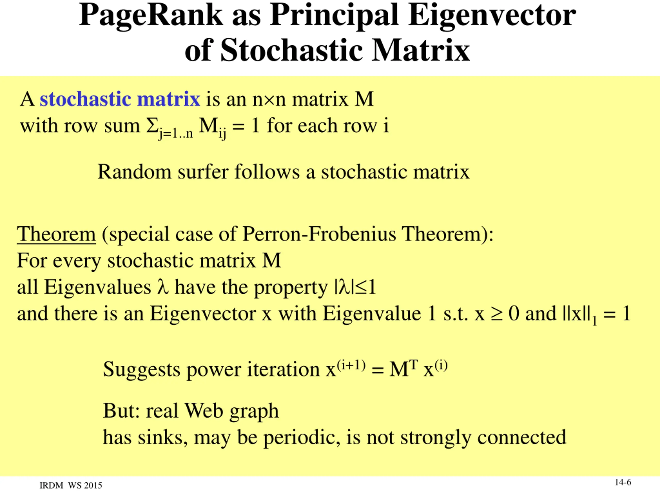 PageRank as Principal Eigenvector of Stochastic Matrix A stochastic matrix is an n n matrix M with row sum j=1..n Mij = 1 for each row i Random surfer follows a stochastic matrix Theorem (special case of Perron-Frobenius Theorem): For every stochastic matrix M all Eigenvalues have the property | | 1 and there is an Eigenvector x with Eigenvalue 1 s.t. x 0 and ||x||1 = 1 Suggests power iteration x(i+1) = MT x(i) But: real Web graph has sinks, may be periodic, is not strongly connected 14-6 IRDM WS 2015