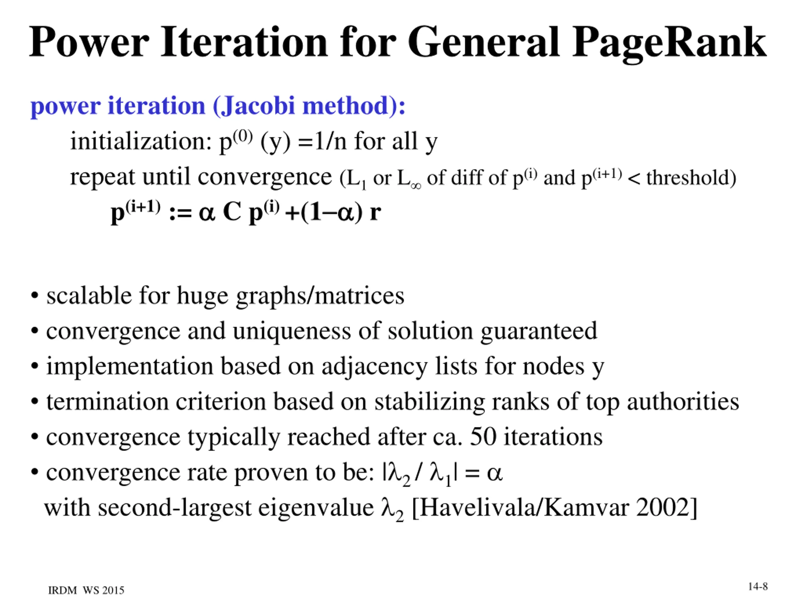 Power Iteration for General PageRank power iteration (Jacobi method): initialization: p(0) (y) =1/n for all y repeat until convergence (L1 or L of diff of p(i) and p(i+1) < threshold) p(i+1) := C p(i) +(1 ) r scalable for huge graphs/matrices convergence and uniqueness of solution guaranteed implementation based on adjacency lists for nodes y termination criterion based on stabilizing ranks of top authorities convergence typically reached after ca. 50 iterations convergence rate proven to be: | 2 / 1| = with second-largest eigenvalue 2 [Havelivala/Kamvar 2002] 14-8 IRDM WS 2015