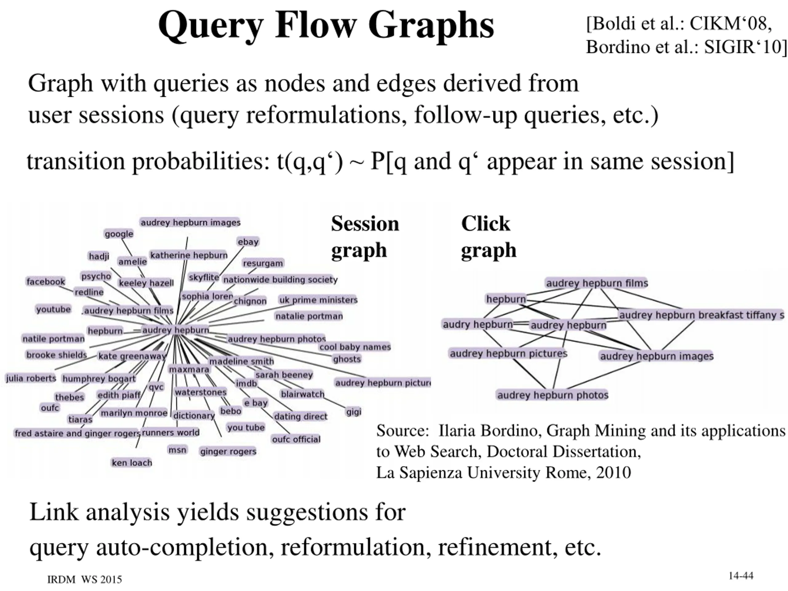 Query Flow Graphs [Boldi et al.: CIKM 08, Bordino et al.: SIGIR 10] Graph with queries as nodes and edges derived from user sessions (query reformulations, follow-up queries, etc.) transition probabilities: t(q,q ) ~ P[q and q appear in same session] Session graph Click graph Source: Ilaria Bordino, Graph Mining and its applications to Web Search, Doctoral Dissertation, La Sapienza University Rome, 2010 Link analysis yields suggestions for query auto-completion, reformulation, refinement, etc. 14-44 IRDM WS 2015