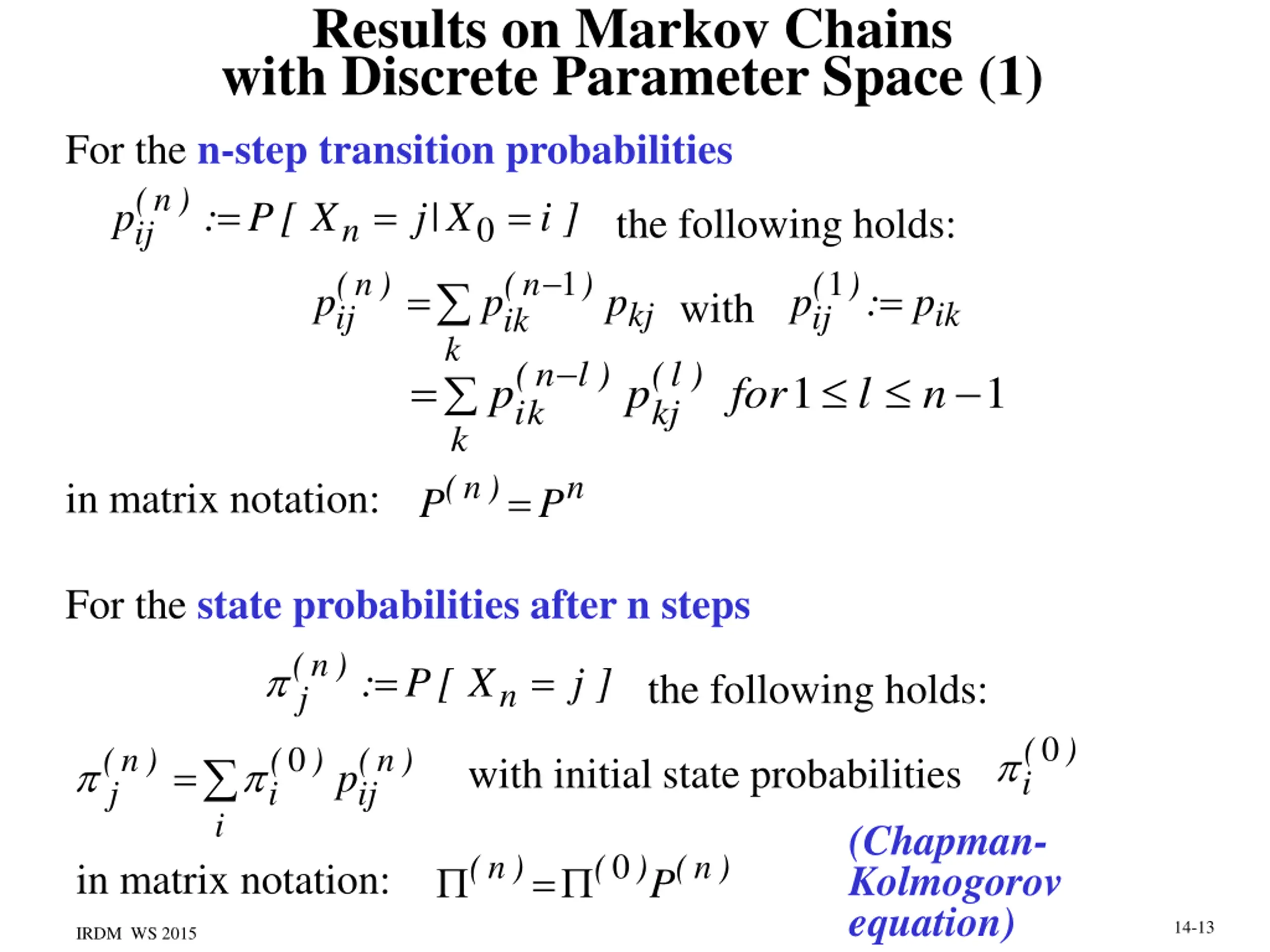 Results on Markov Chains with Discrete Parameter Space (1) For the n-step transition probabilities i X | j X [ P : p n ij 0 = k = p k in matrix notation: P P = ( n ) = = = ] the following holds: 1 1 ( ij n ) ( ik ( ik n ) ( ij ) = p : p p p p with kj ik n ) l ) l ( kj 1 1 p for l n ( n ) n For the state probabilities after n steps ) n ( j = = : P [ X j ] the following holds: n 0 ( i ) 0 ( j n ) ( i ) ( ij n ) i = with initial state probabilities p (Chapman- Kolmogorov equation) 0 ( n ) ( ) ( n ) = in matrix notation: P 14-13 IRDM WS 2015