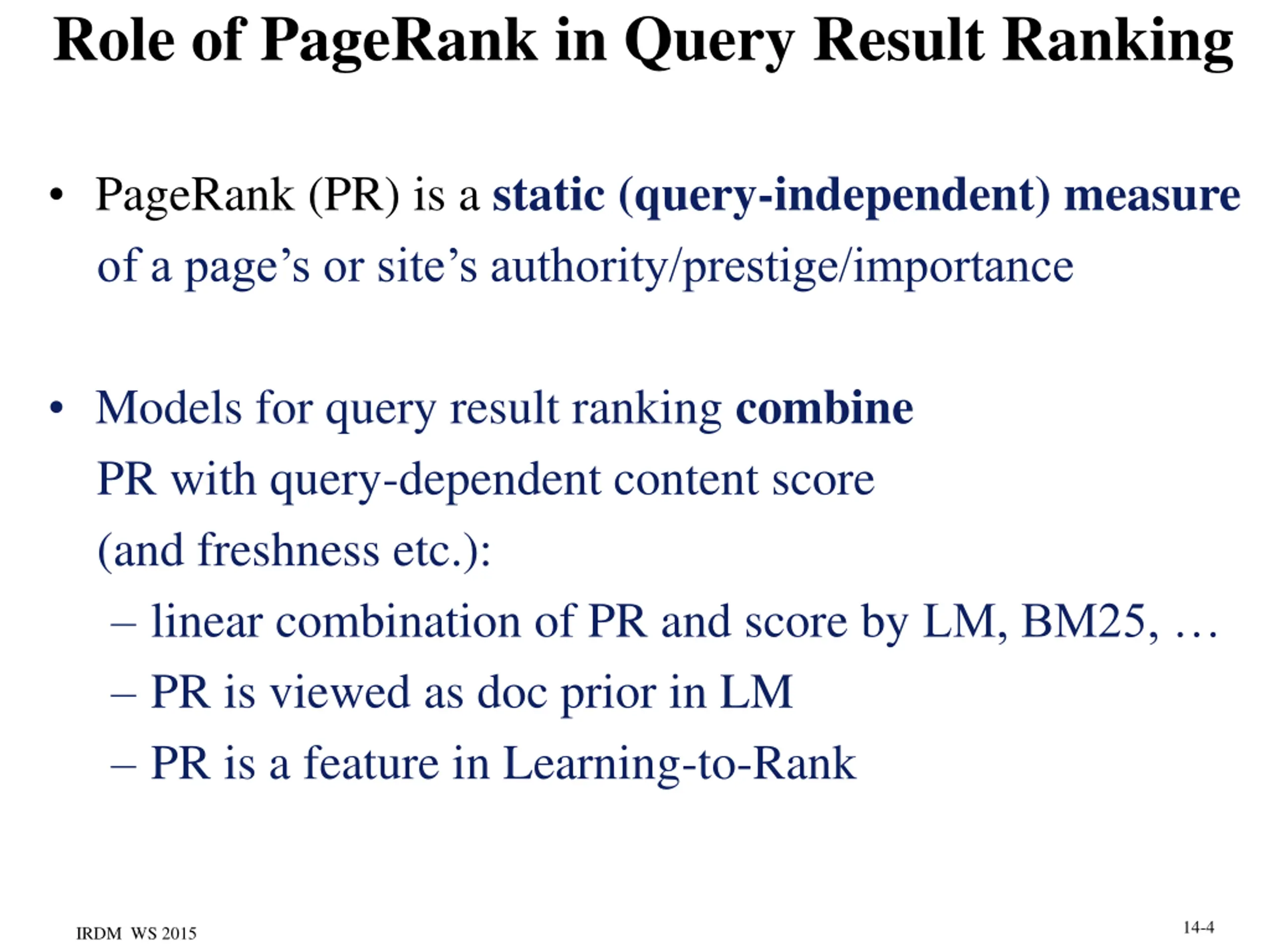 Role of PageRank in Query Result Ranking PageRank (PR) is a static (query-independent) measure of a page s or site s authority/prestige/importance Models for query result ranking combine PR with query-dependent content score (and freshness etc.): linear combination of PR and score by LM, BM25, PR is viewed as doc prior in LM PR is a feature in Learning-to-Rank 14-4 IRDM WS 2015